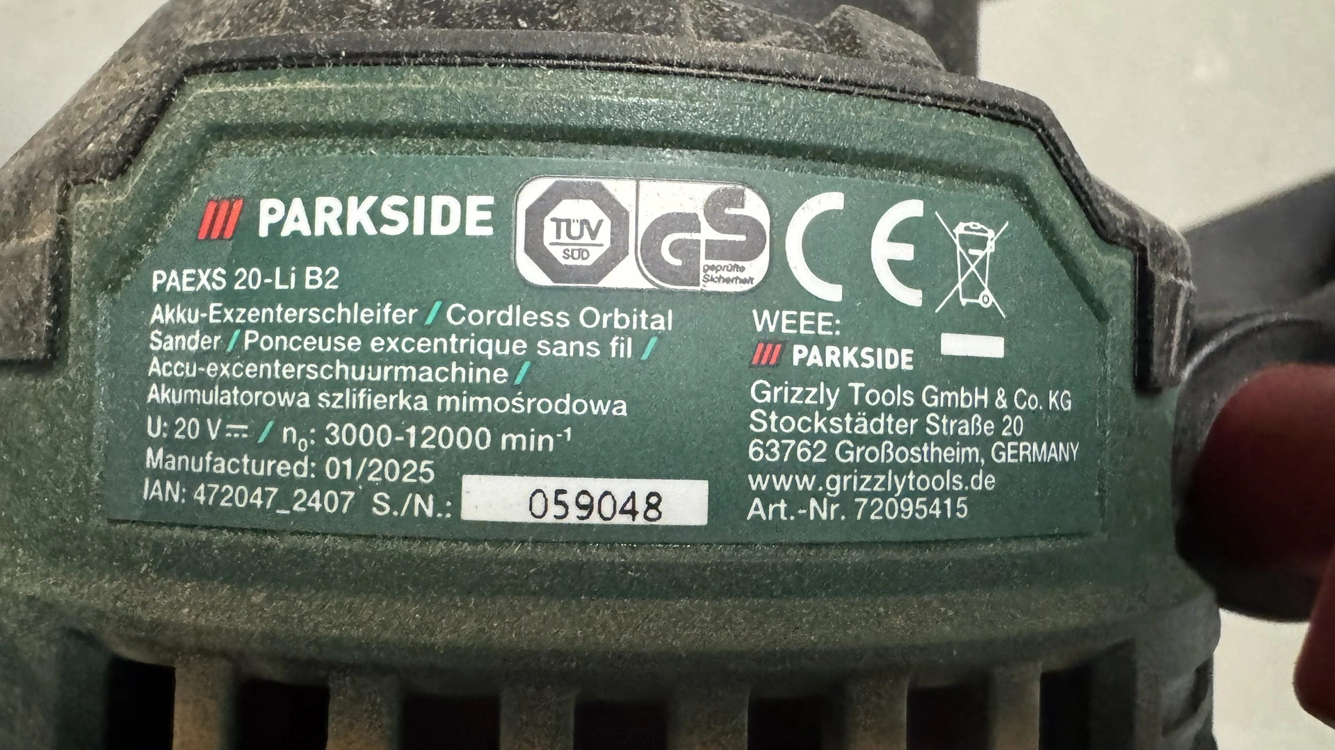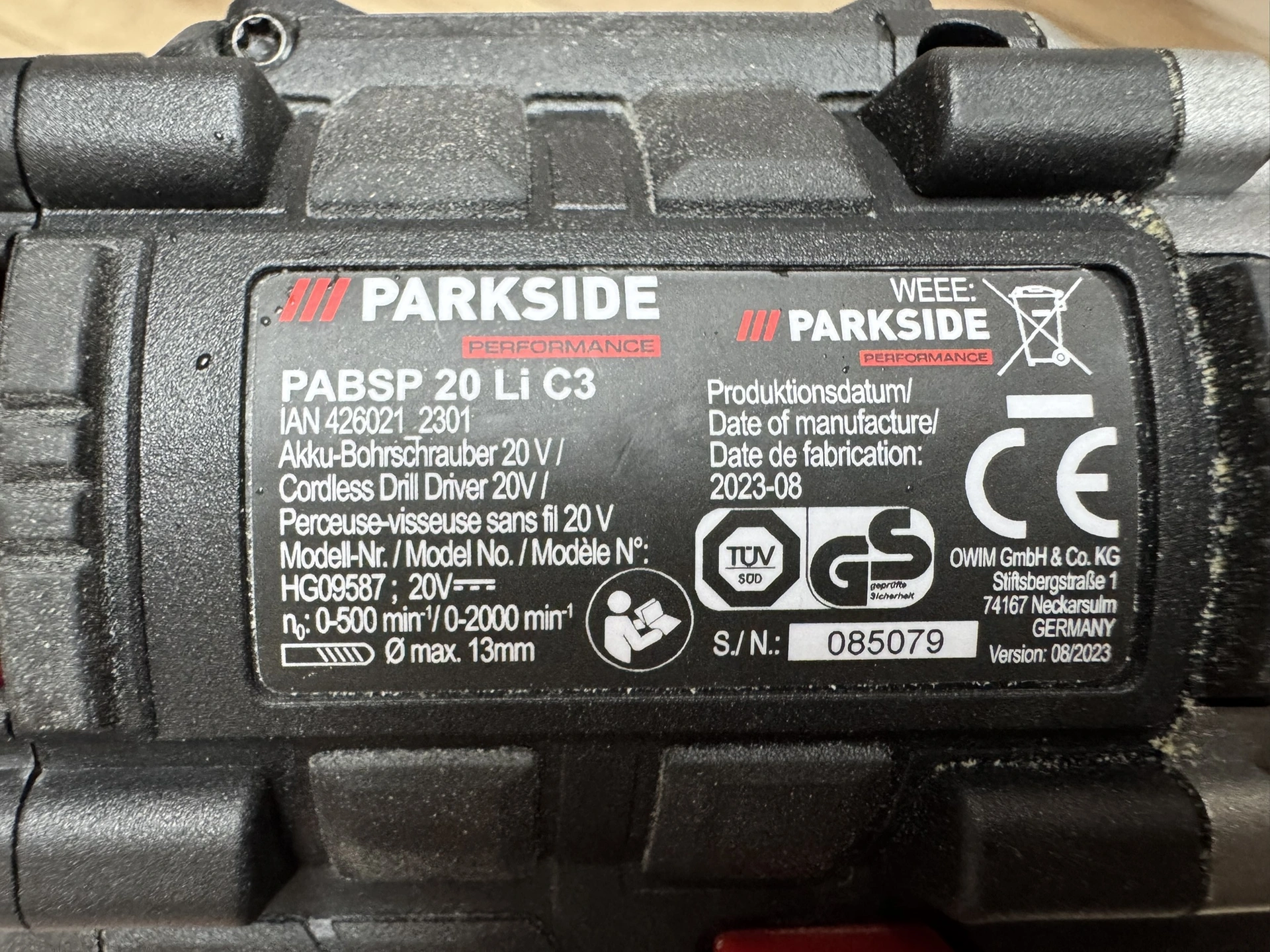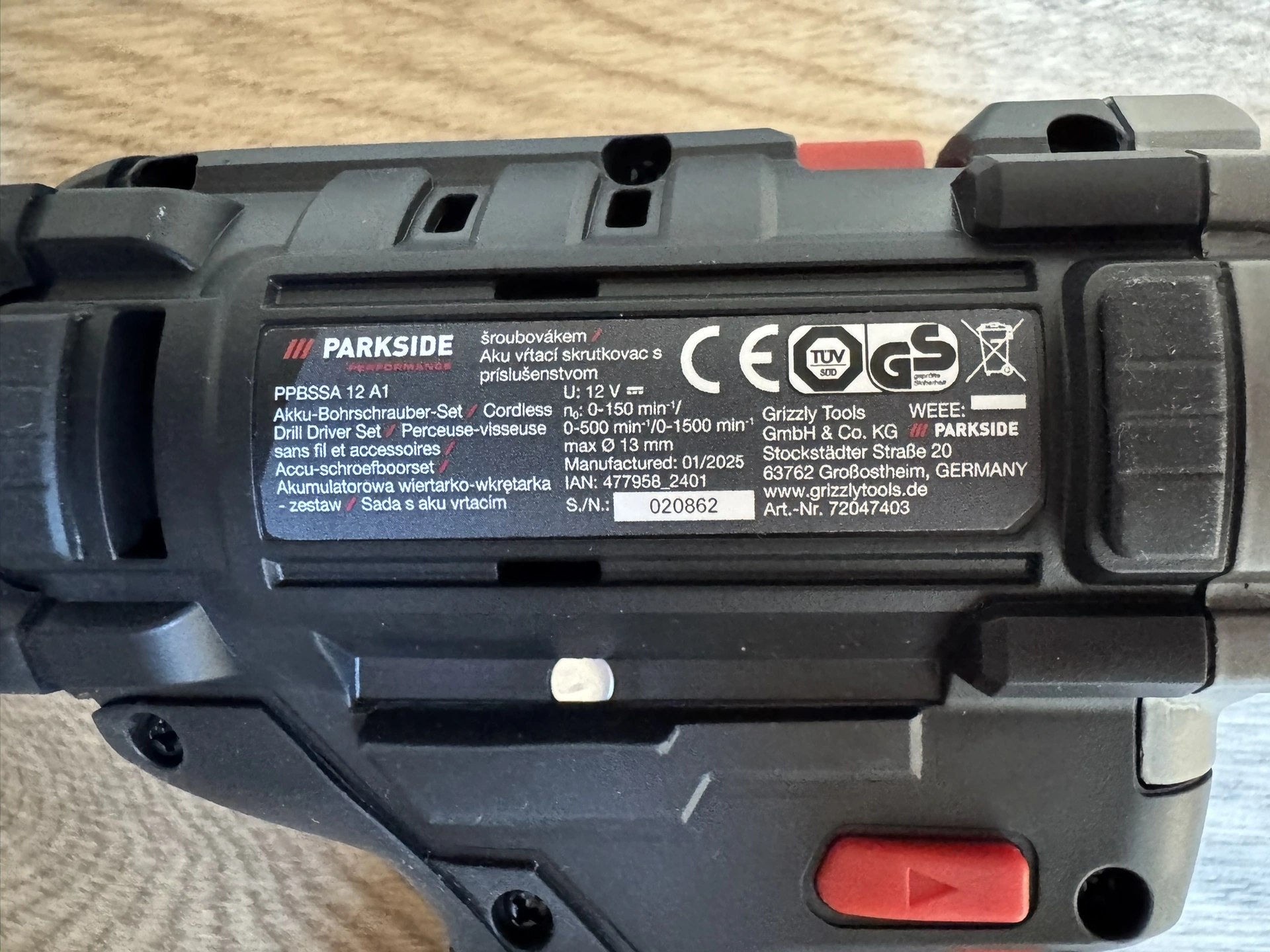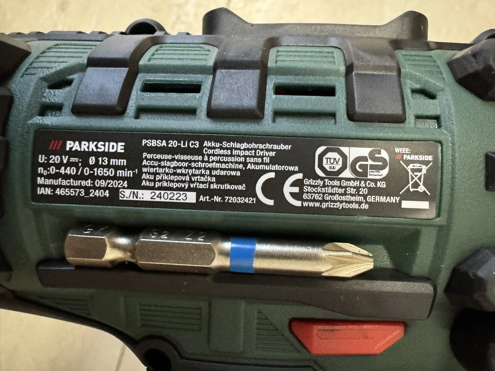 Foto: Lucie Sobotová, ArecenzeVýrobní štítek příklepové aku vrtačky Parkside Performance PSBSAP 20-Li C3 – produkt dodává společnost Grizzly Tools GmbH & Co. KG