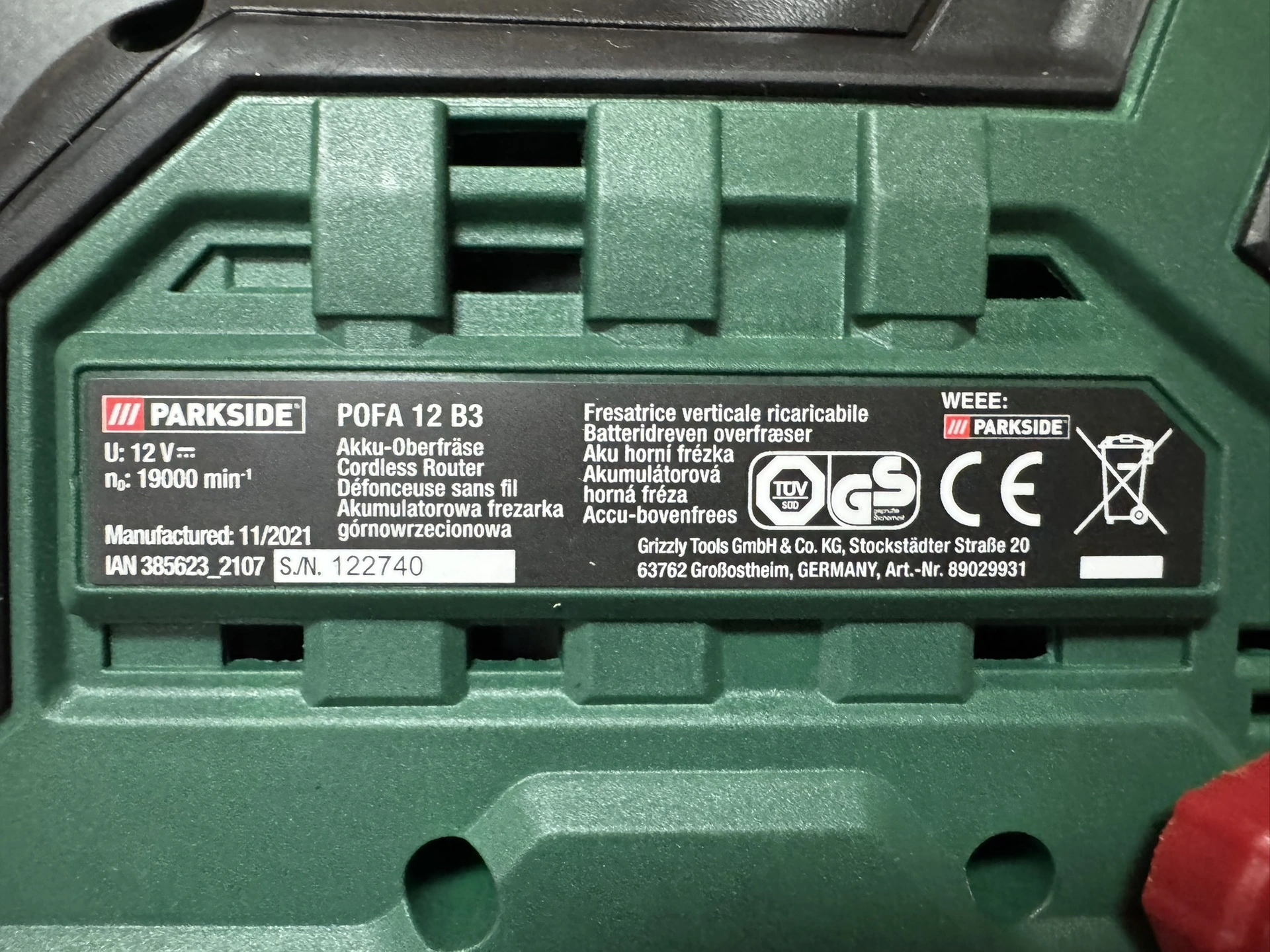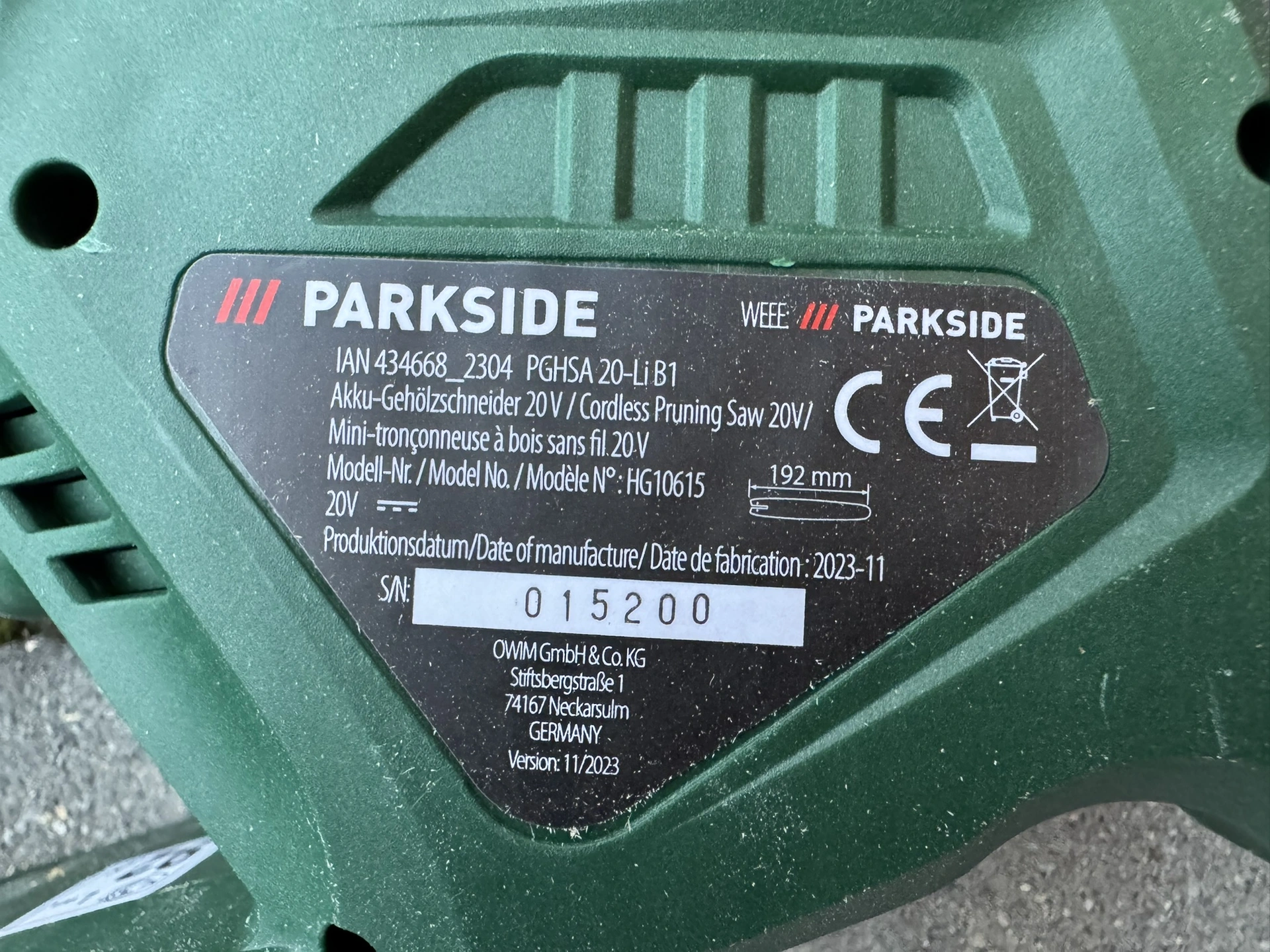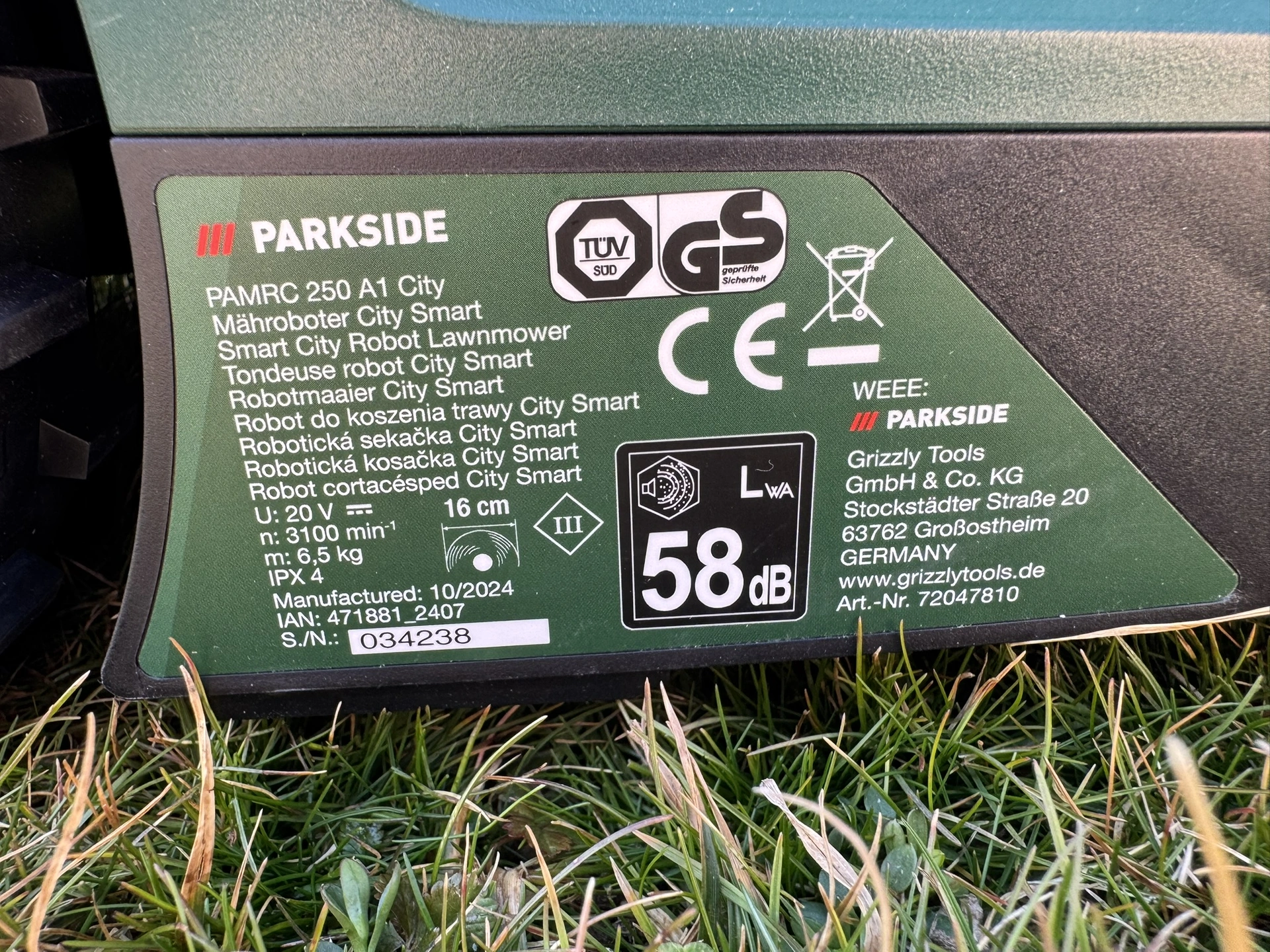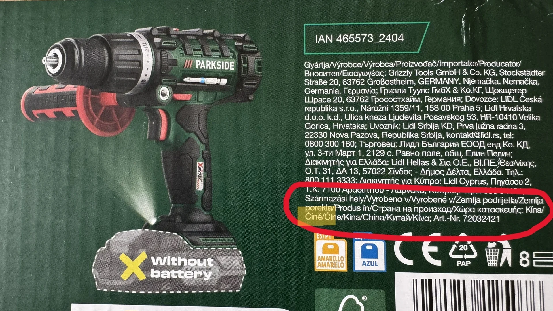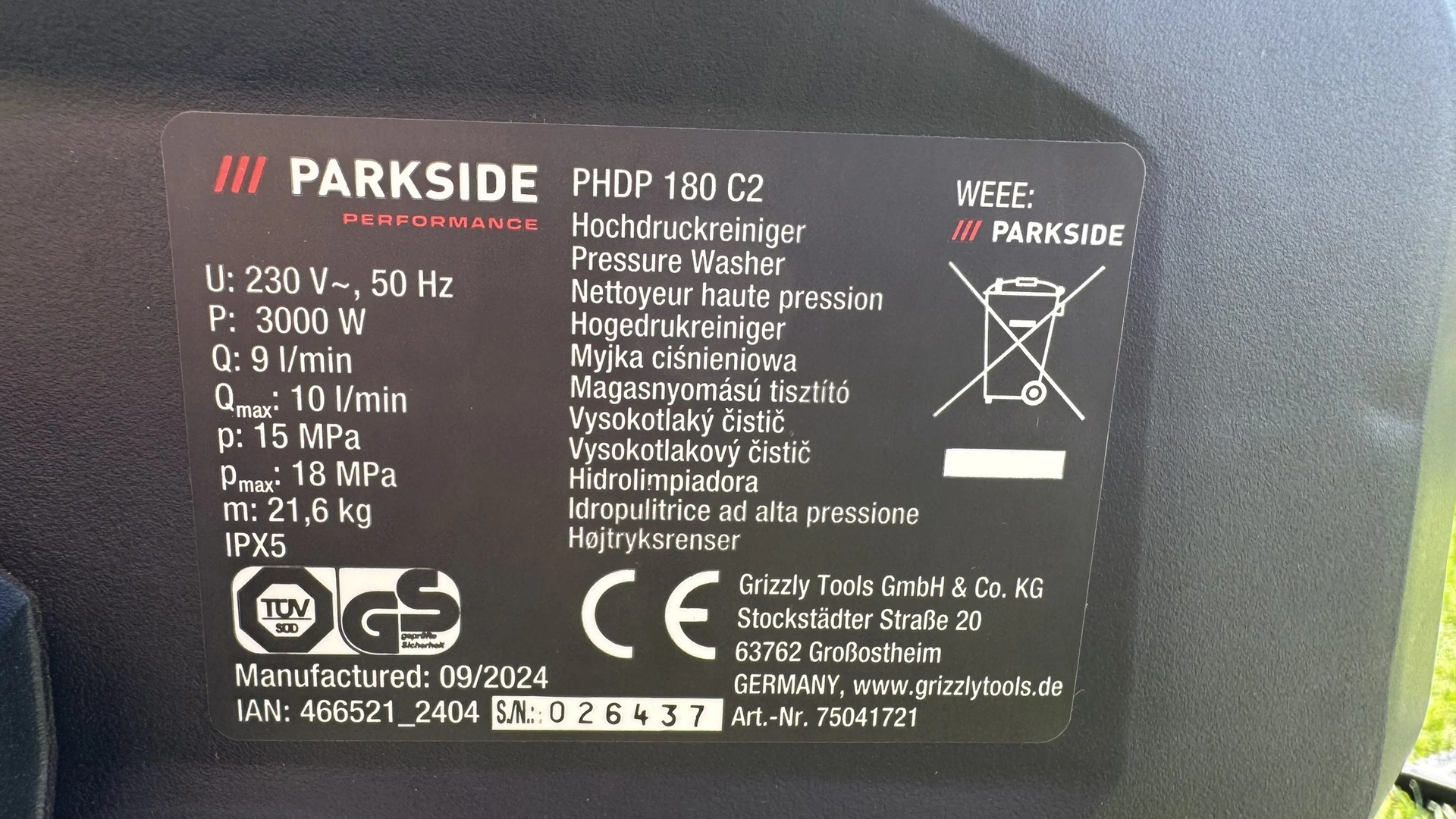 Foto: Lucie Sobotová, ArecenzeVýrobní štítek příklepové aku vrtačky Parkside Performance PSBSAP 20-Li C3 – produkt dodává společnost Grizzly Tools GmbH & Co. KG
