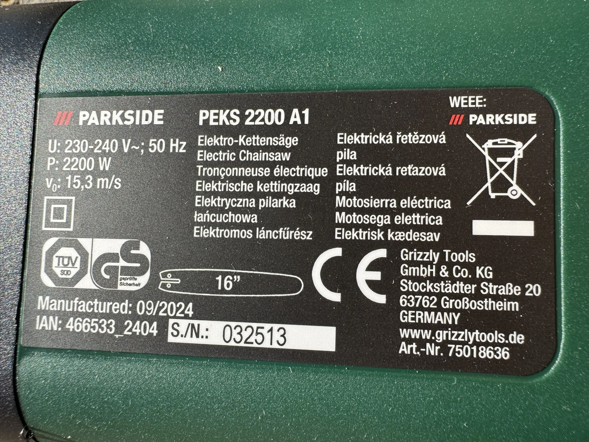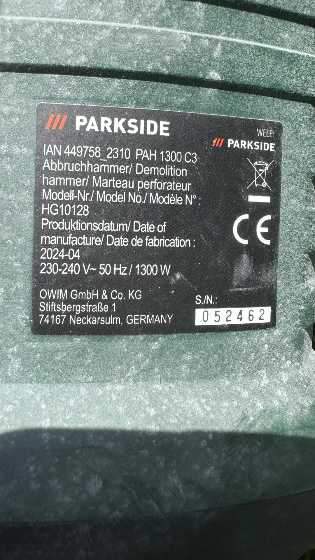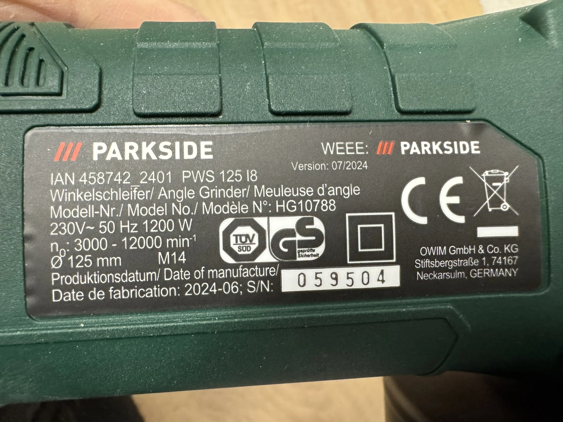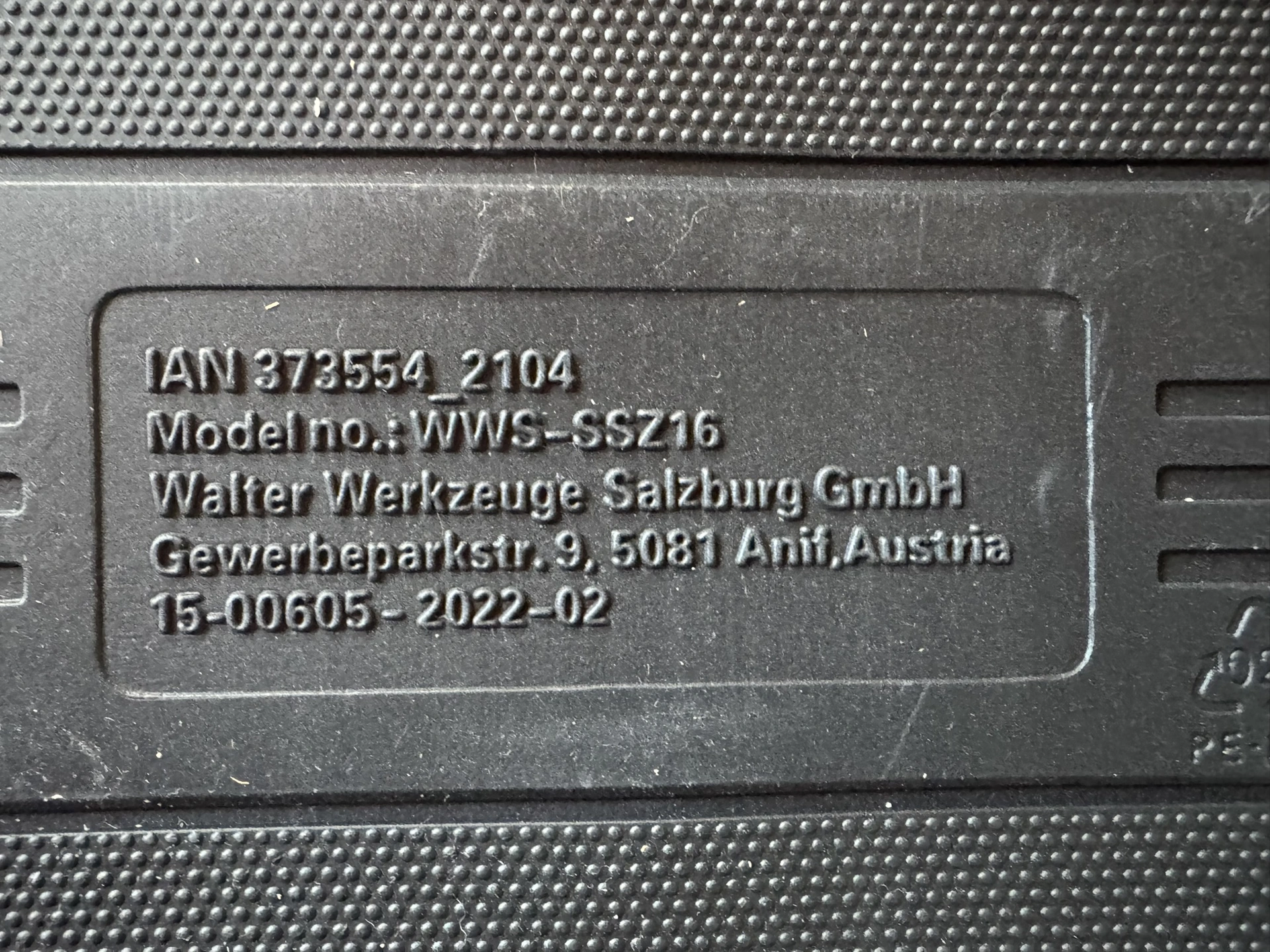 Foto: Lucie Sobotová, ArecenzeVýrobní štítek příklepové aku vrtačky Parkside Performance PSBSAP 20-Li C3 – produkt dodává společnost Grizzly Tools GmbH & Co. KG