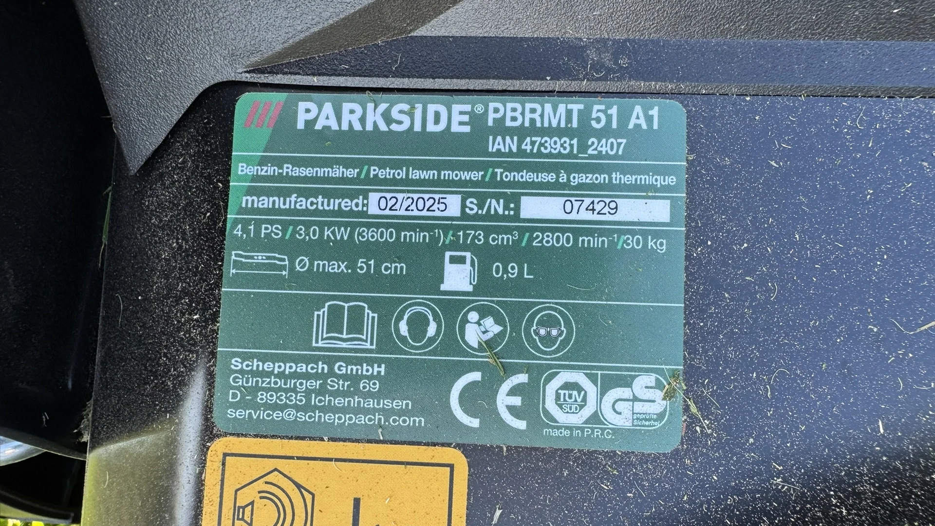 Foto: Lucie Sobotová, ArecenzeVýrobní štítek loni testované benzínové sekačky Parkside PBRMT 51 A1, kterou dodává Scheppach GmbH