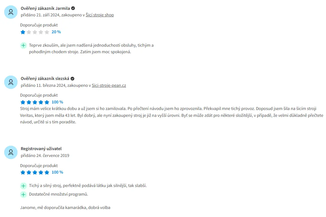 V uživatelských recenzích se často objevuje pochvala za plynulé podávání látky a tichý chod. Celkově jde o rozumný kompromis mezi cenou, výbavou a komfortem při práci.