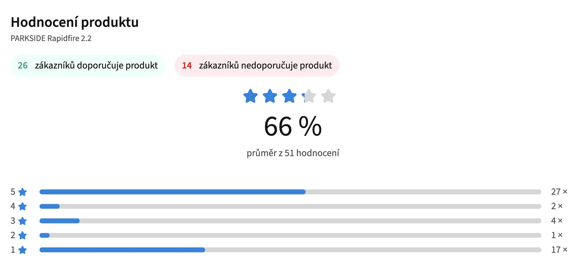 Aku šroubovák Parkside Rapidfire 2.2 patří dlouhodobě mezi nejhůře hodnocené produkty značky Parkside. Aktuálně jej nedoporučuje 35 % uživatelů a oproti loňskému roku 2025, kdy jej nedoporučovalo 34 % uživatelů, tak počet negativních recenzí ještě vzrostl. Uživatelé si přitom nejvíce stěžují na nízký točivý moment a slabý výkon. Výtky mají také ke slabé baterii, která se rychle vybíjí, a někteří uživatelé hlásí také častý výskyt závad a problémy s nabíjením.