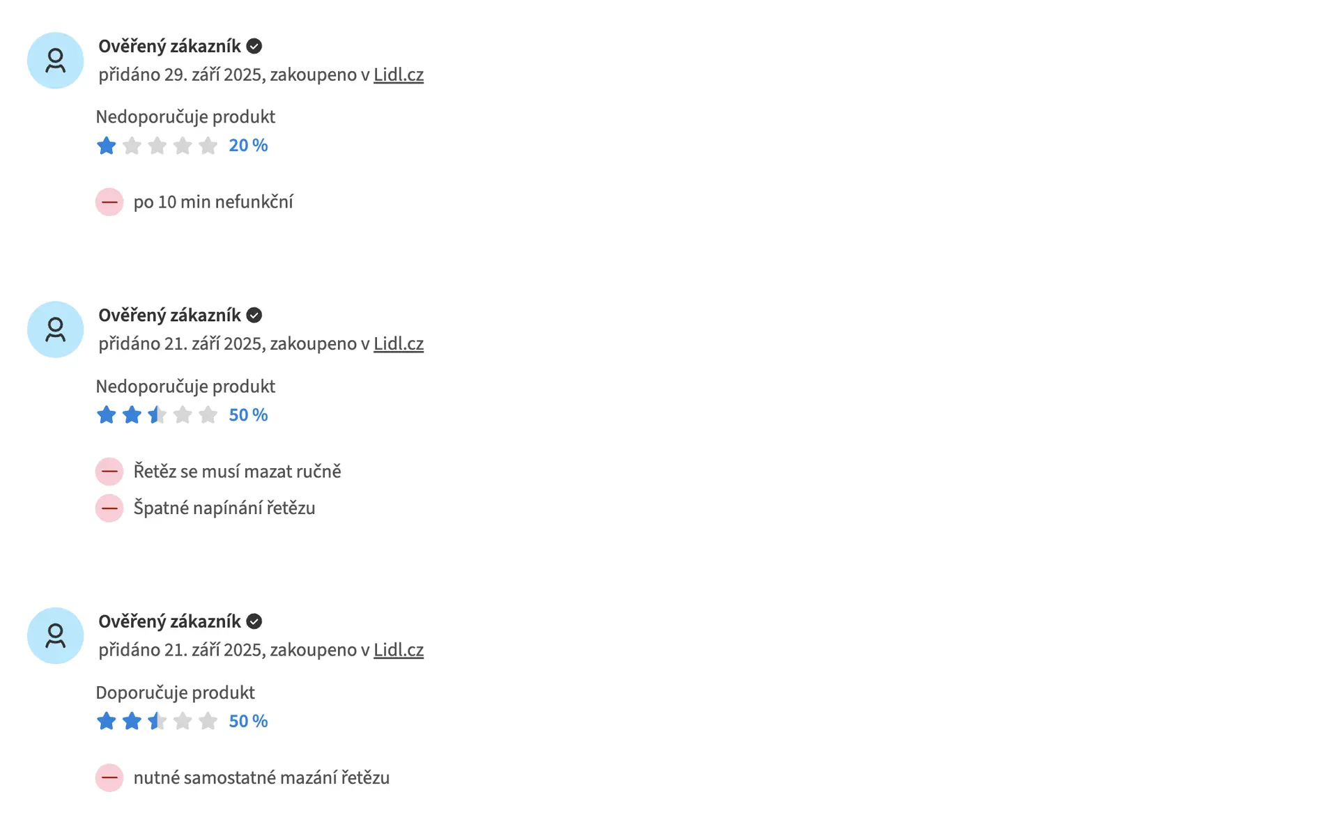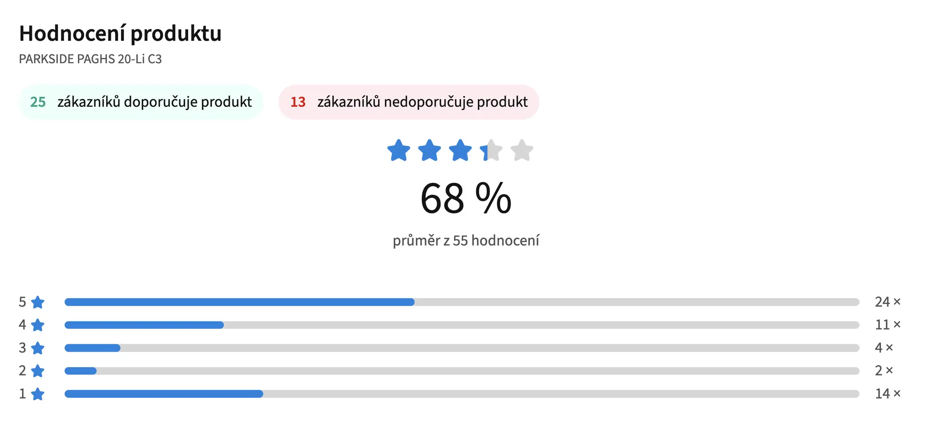 Akumulátorová pila Parkside PAGHS 20-Li C3 rovněž nesklízí příliš kladná uživatelská hodnocení. Celkově ji nyní nedoporučuje 34 % uživatelů a v záporných recenzích se objevují výtky k řetězu, který je nutné mazat ručně. Podle ohlasů se také často vyskytují vadné kusy, kdy po pár minutách zařízení přestane fungovat.