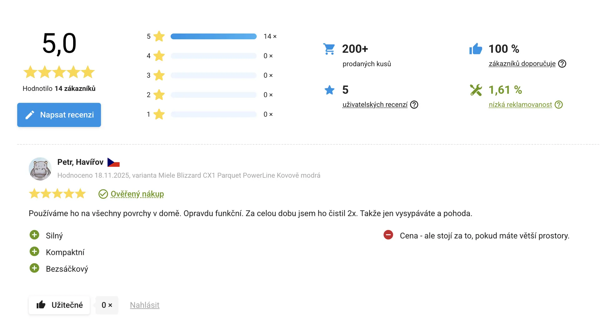 Úklid podlah a koberců v domácnosti je pro někoho každodenní rutinou. K tomu, aby byl úklid co nejpohodlnější, rychlý a efektivní, je potřeba mít kvalitní vysavač. Pokud dáte na hodnocení a chcete vysavač, který doporučuje 100 % uživatelů, vsaďte na bezsáčkový model Miele Blizzard CX1 Parquet PowerLine SKCF5. Aktuálně jeho celkové skóre hodnocení na webu Heureka dosahuje 98 %, na Alze má dokonce 5 hvězdiček z 5.