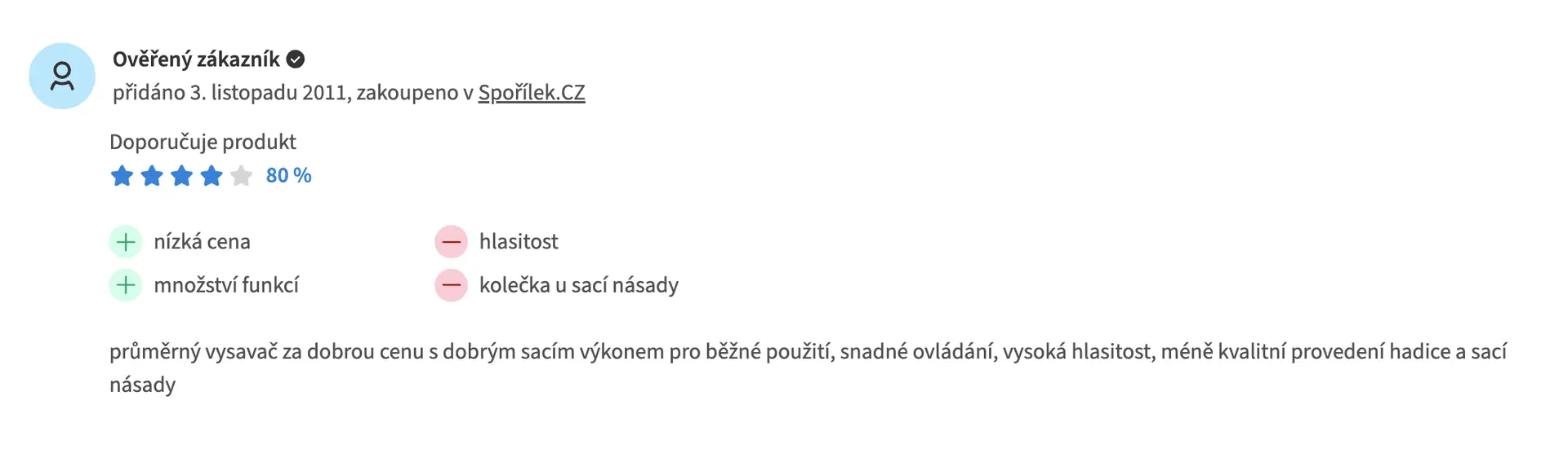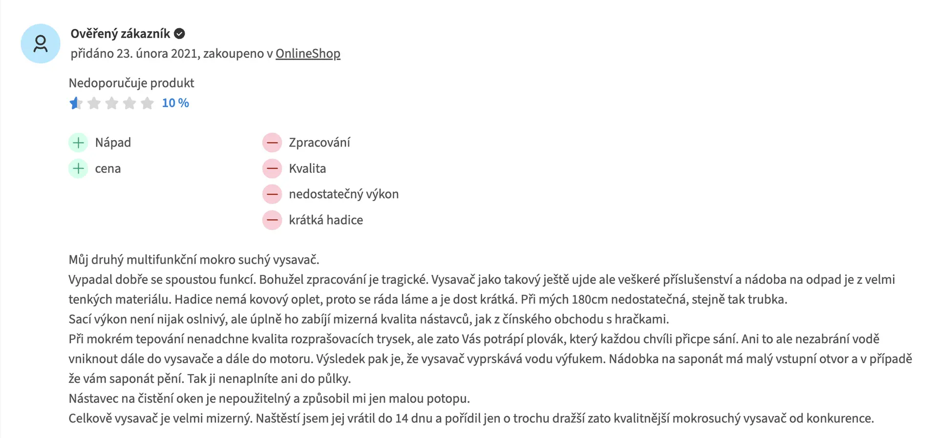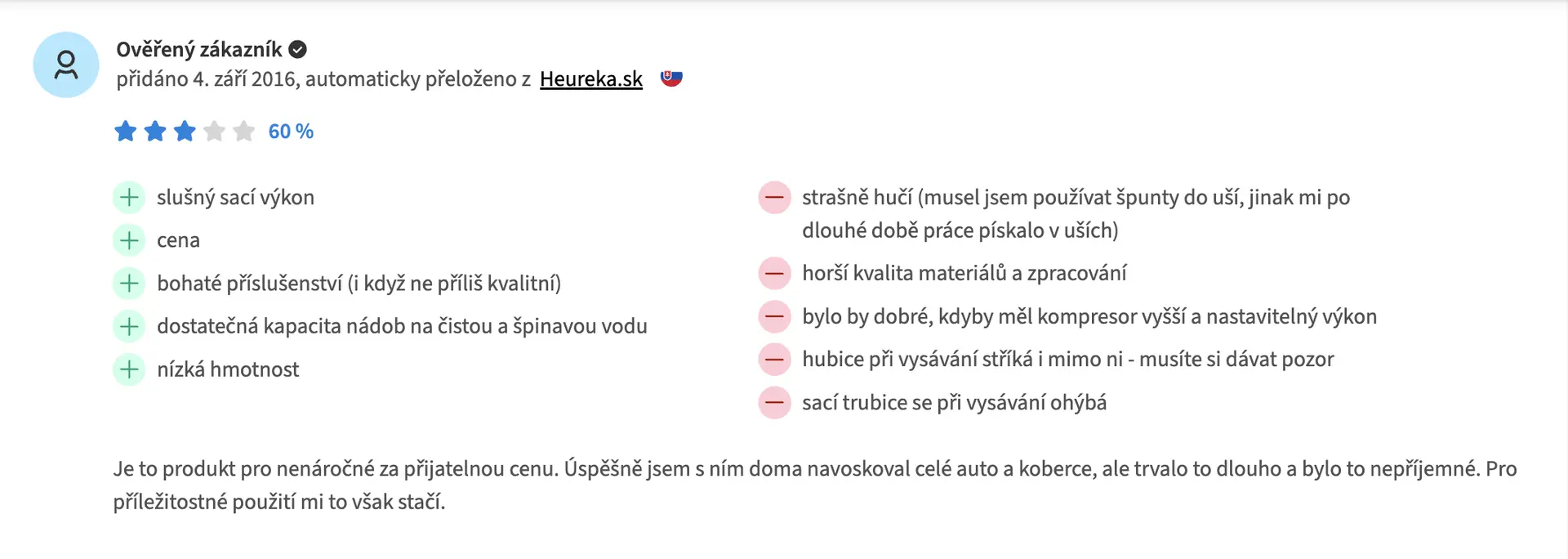 Foto: Vlastní screenshot, Heureka.czUkázka uživatelské recenze