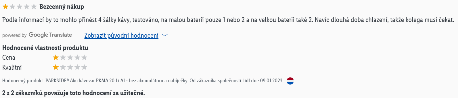 Tento produkt je určen k přípravě čerstvé kávy bez nutnosti připojení k elektrické síti, například na zahradě nebo při pikniku.  Čtyřicet jedna uživatelů jej na Heuréce hodnotilo průměrnou známkou 70 %. Na e-shopu Lidl má průměrnou známku 3,9 bodů z pěti při 202 hodnoceních.