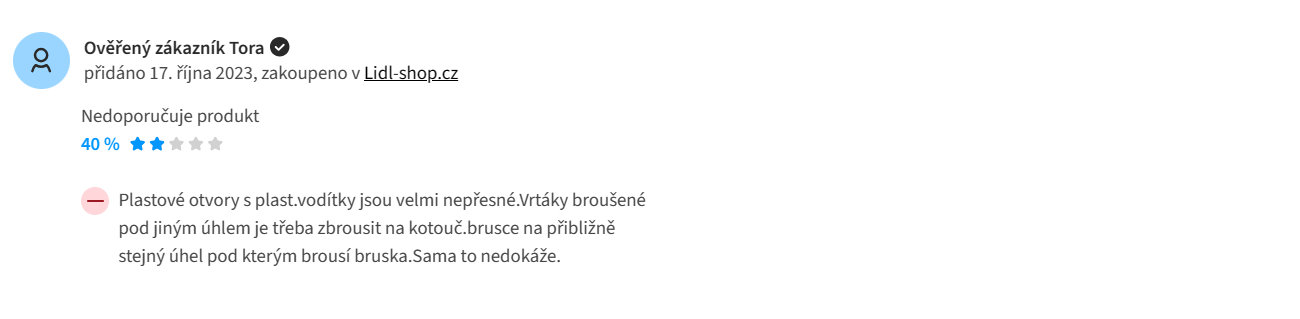 Uživatelé, kteří produktu udělili negativní hodnocení především zmiňují, že ostření vrtáků je velmi nekvalitní, což podle nich plyne z nízké přesnosti plastových vodících otvorů.