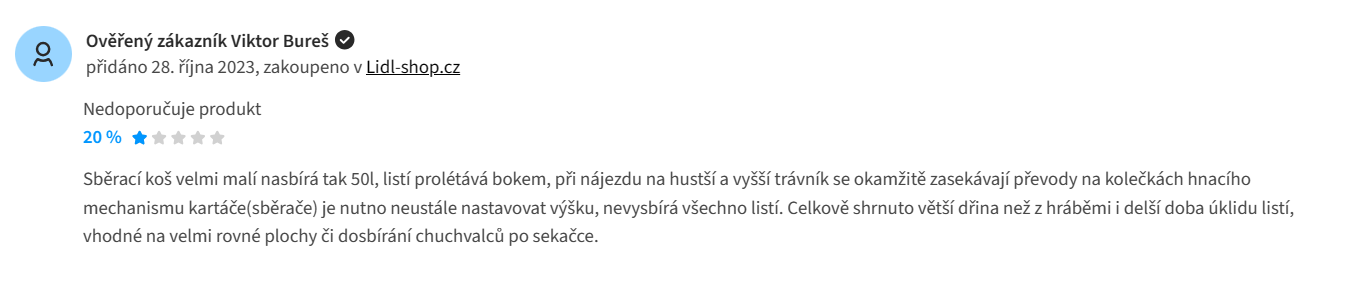 Největší výtky mají zákazníci vůči málo odolným plastovým dílům, stěžují si také na to, že listí je třeba přejíždět několikrát. Malé listy potom sběrač nesbírá vůbec. Zmíněn je i problém s příliš krátkým madlem.