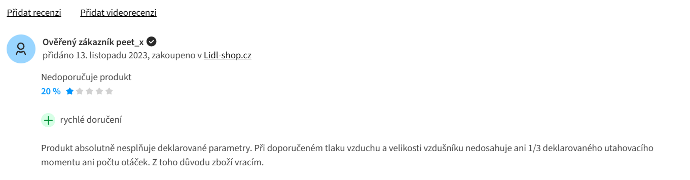 Pneumatický utahovák by měl poskytovat především vysoký výkon. Tento konkrétní produkt si na webu Heureka vysloužil od 51 zákazníků hodnocení 69 %, na e-shopu Lidl jej potom 23 zákazníků hodnotilo průměrnou známkou 4,2 z 5. Právě nedostatečný výkon, a to i s kvalitním kompresorem, je nejčastějším problémem, který zákazníci zmiňují.