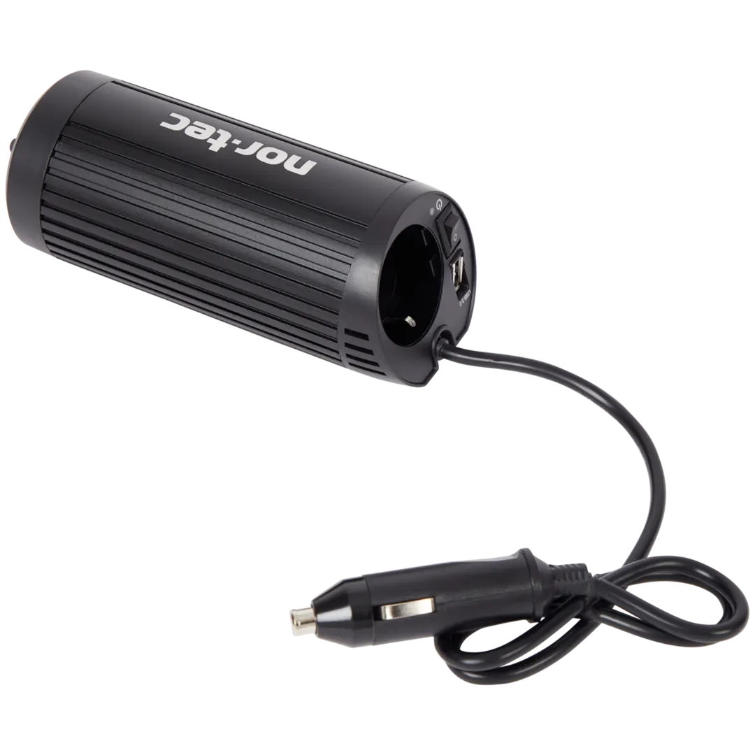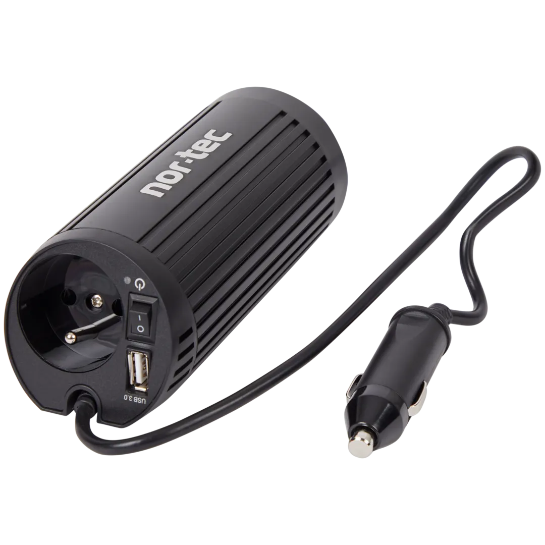 Do pětistovky za kus je problém vtěsnat zázraky, takže realisticky. Je to drobná krabice s jednou běžnou zásuvkou a USB portem. Zapojí se do cigaretového zapalovače, který má v palubní desce skoro každé auto. Výstup má 150 wattů. Tvarem je uzpůsobená přímo do držáku na nápoje, takže v zatáčkách nelétá po autě. Zapínání a vypínání řeší spínač přímo na těle, což zní banálně, ale na dlouhých cestách se cení. Stačí vypnout, když odjíždíte z místa a necháváte auto delší dobu stát.