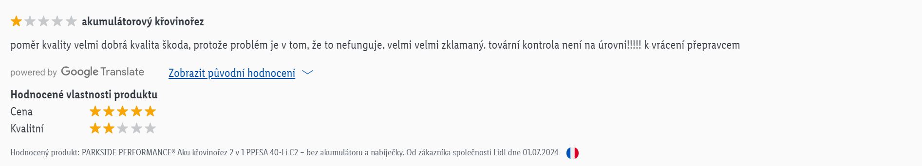 Na Heurece má Parkside PPFSA 40-Li C2 z 18 uživatelských hodnocení průměr 95 % a 100 % uživatelů jej doporučuje (červenec 2024). Na Lidl-shopu získal z 42 hodnocení 82 % a 84 % uživatelů jej doporučuje. Uživatelé si chválí především jednoduchou obsluhu a na aku provedení překvapivý výkon.