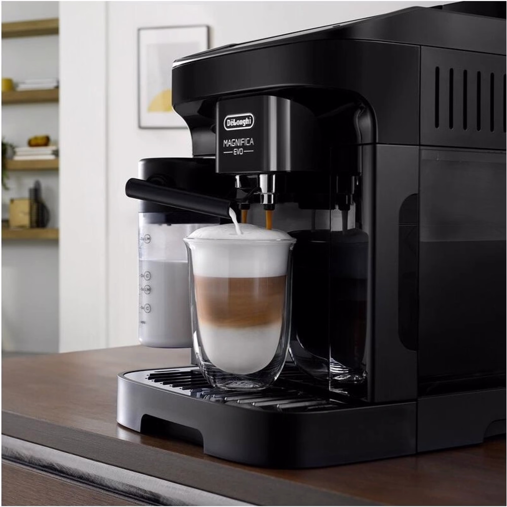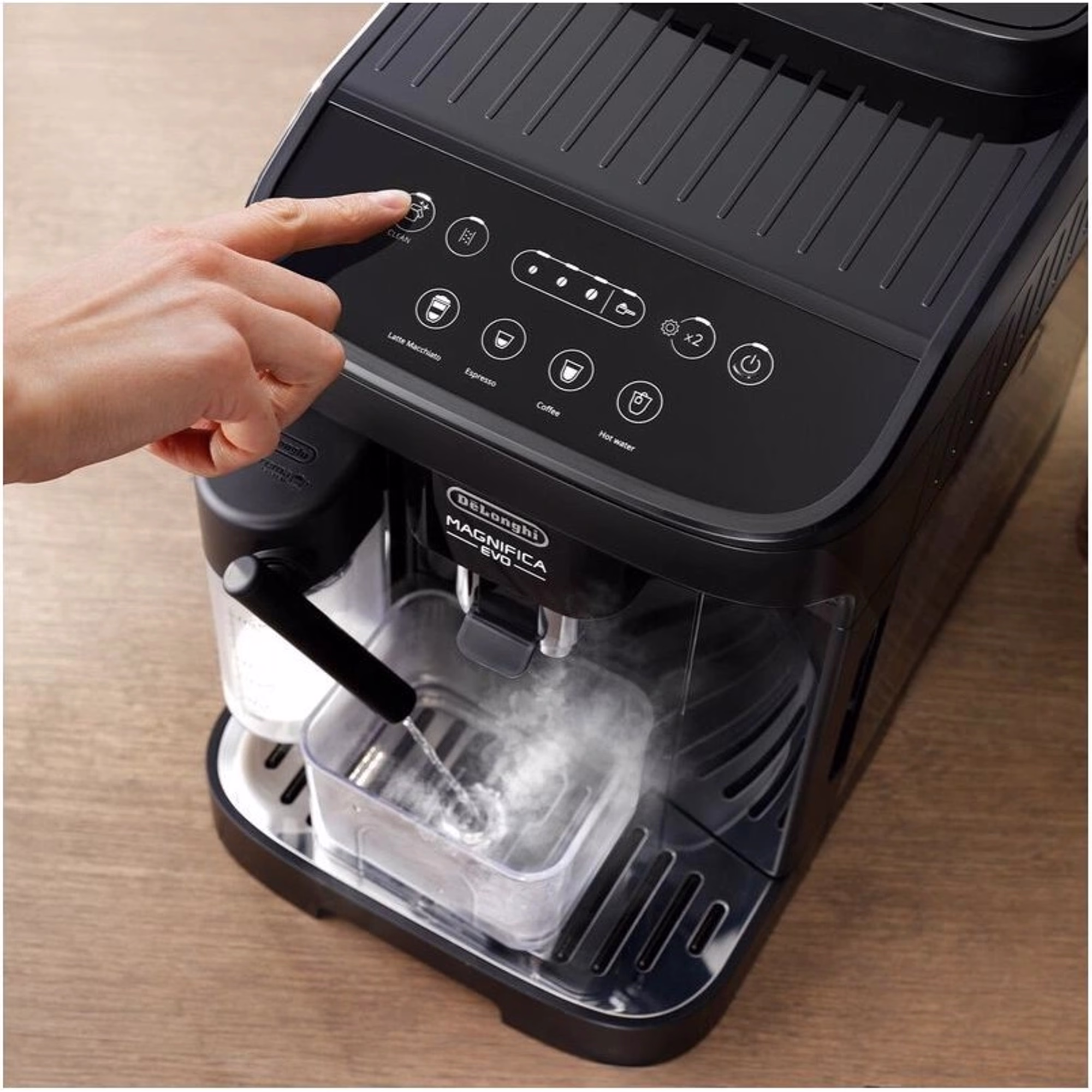Magnifica Evo je typická volba pro lidi, kteří už nechtějí řešit pěnění mléka tryskou, ale současně nepotřebují „padesát nápojů“. V popisu se objevují přímé volby přes barevná tlačítka, automatický systém pěnění mléka LatteCrema, ocelový mlýnek s 13 stupni a termoblok. Tím se tento model posouvá do kategorie, kde je cílem udělat cappuccino rychle bez toho, aby člověk musel mít baristický cvik.