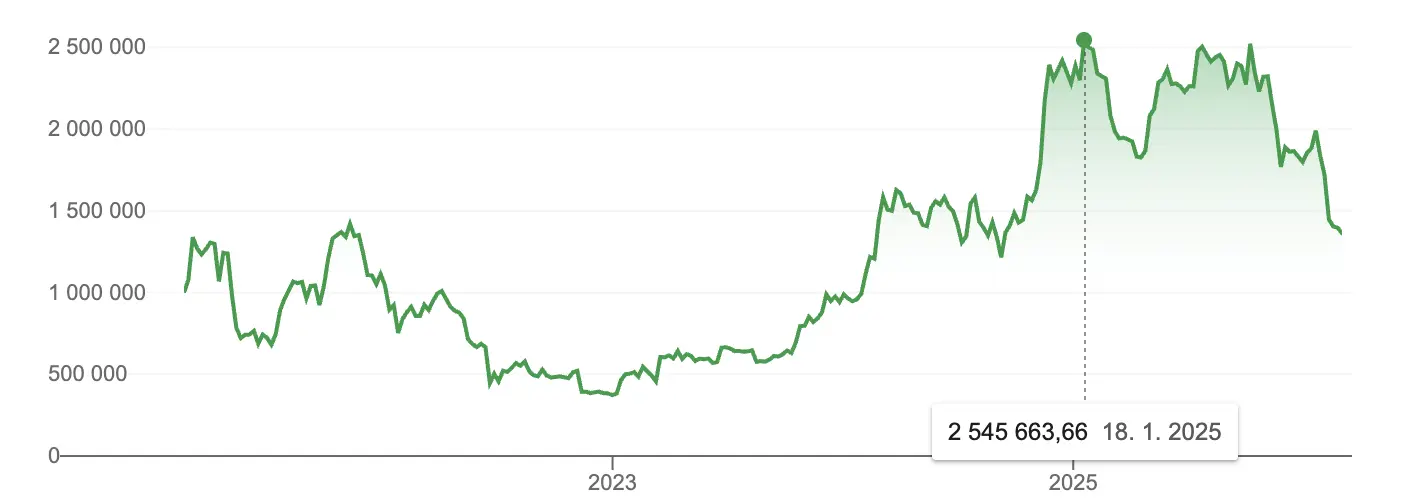 Foto: Screenshot, vyhledávání Google.comTakto vypadá aktuální pětiletý graf bitcoinu. Z maxima 2,5 milionu za jeden bitcoin klesl na současných 1,3 milionu korun za bitcoin.