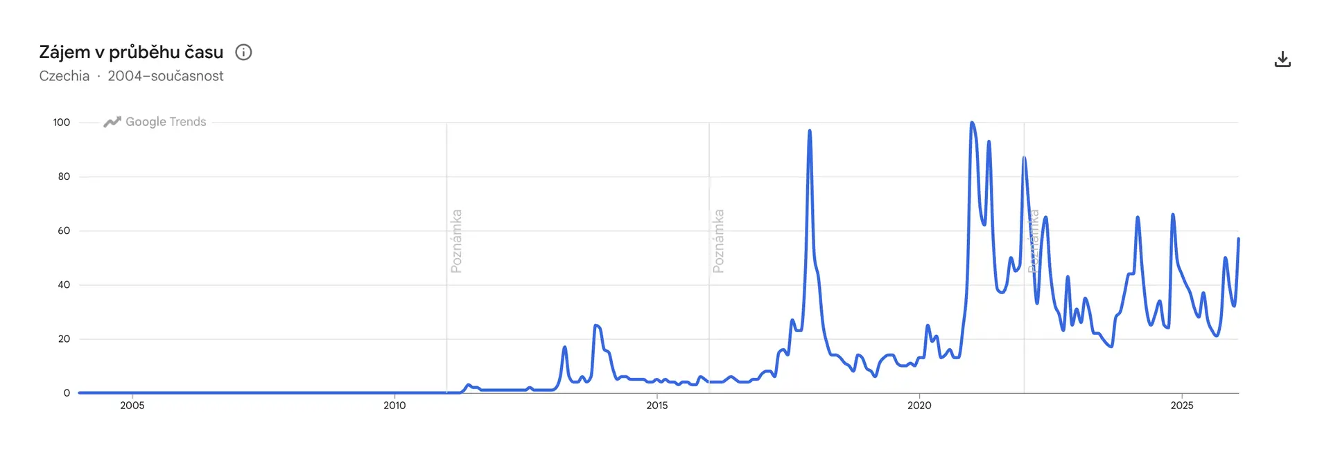 Foto: Screenshot, trends.google.comZájem o bitcoin v ČR od roku 2004 postupně rostě. V roce 2021 narazil na prozatimní vrchol.