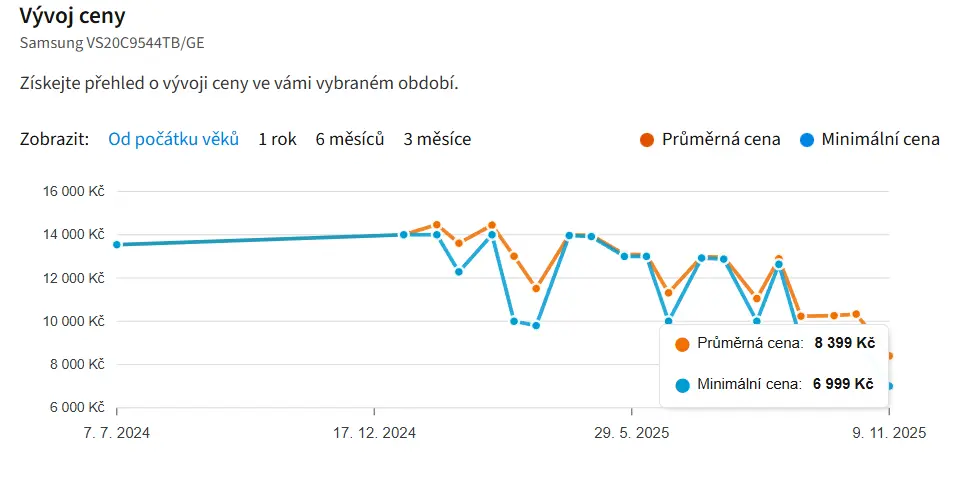 Poslední průměrná cena vysavače Samsung VS20C9544TB/GE byla 8 399 Kč
