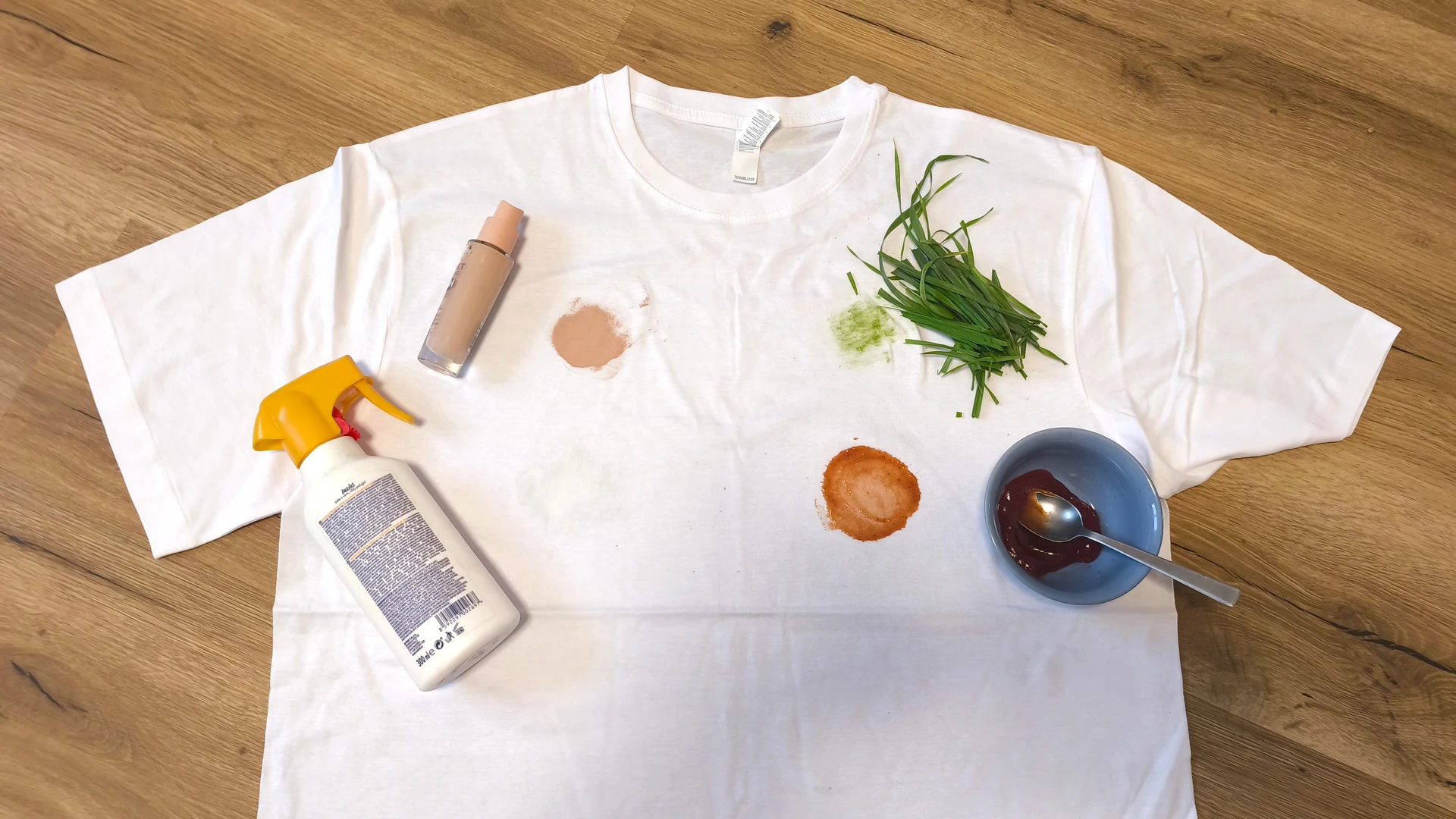 Také tentokrát budeme testovat na bílých bavlněných tričkách. Na každé z nich naneseme čtyři skvrny, které patří mezi ty nejběžnější a zároveň nejotravnější v běžné domácnosti. Konkrétně půjde o kečup, trávu, opalovací krém a make-up. Tato kombinace není náhodná. Každá ze skvrn je trochu jiná a na prací gel klade jiný nárok. Zatímco tráva umí potrápit pigmentem, make-up a opalovací krém bývají problémové kvůli mastnějším složkám. Kečup zase představuje typickou skvrnu z běžného provozu, kterou dobře zná snad každá rodina s dětmi.