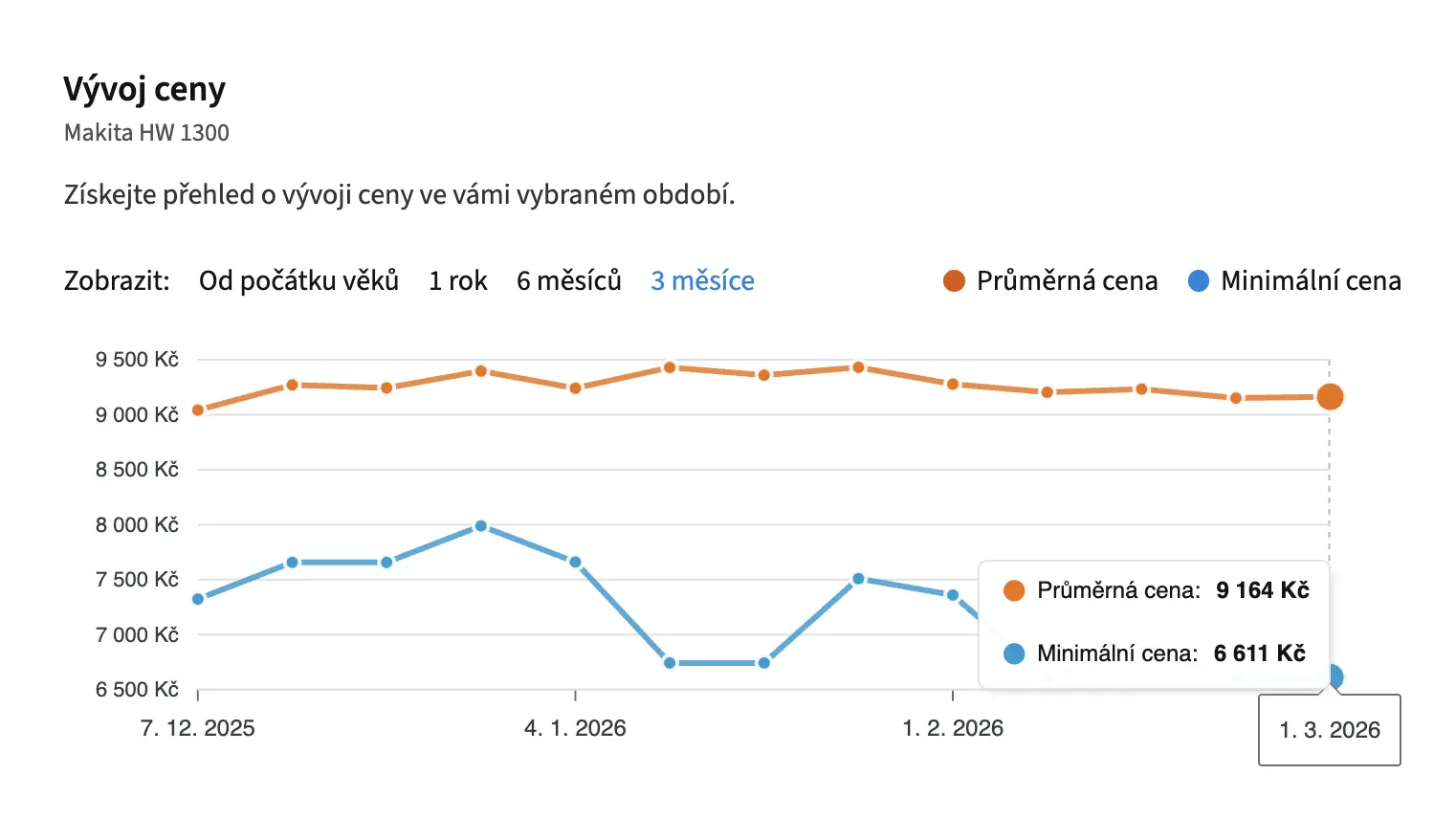 Foto: Heureka (se svolením)Vývoj ceny vysokotlaké myčky Makita HW 1300