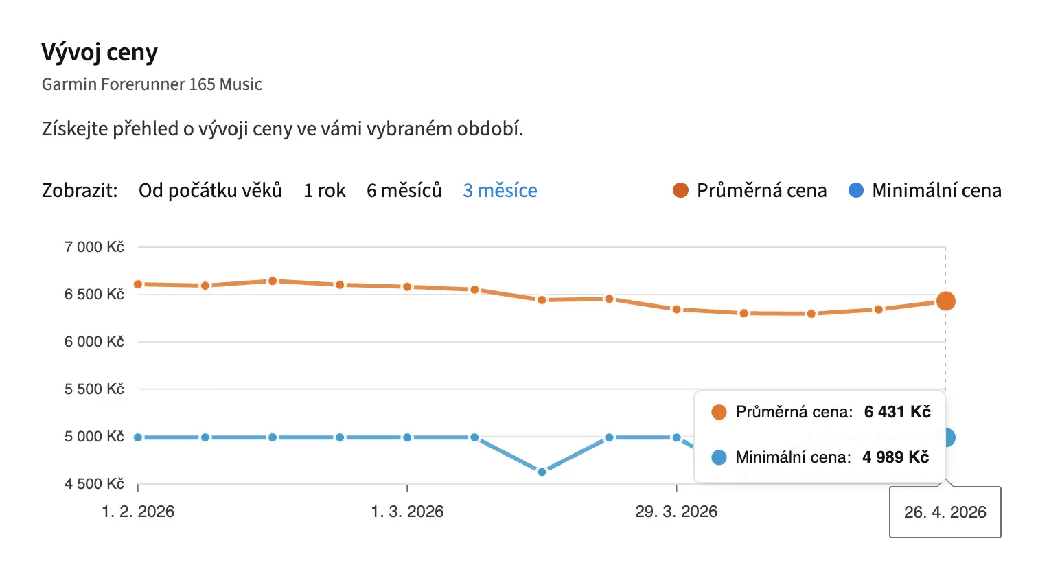 Foto: Vlastní screenshot, HeurekaVývoj ceny sportovních hodinek Garmin Forerunner 165