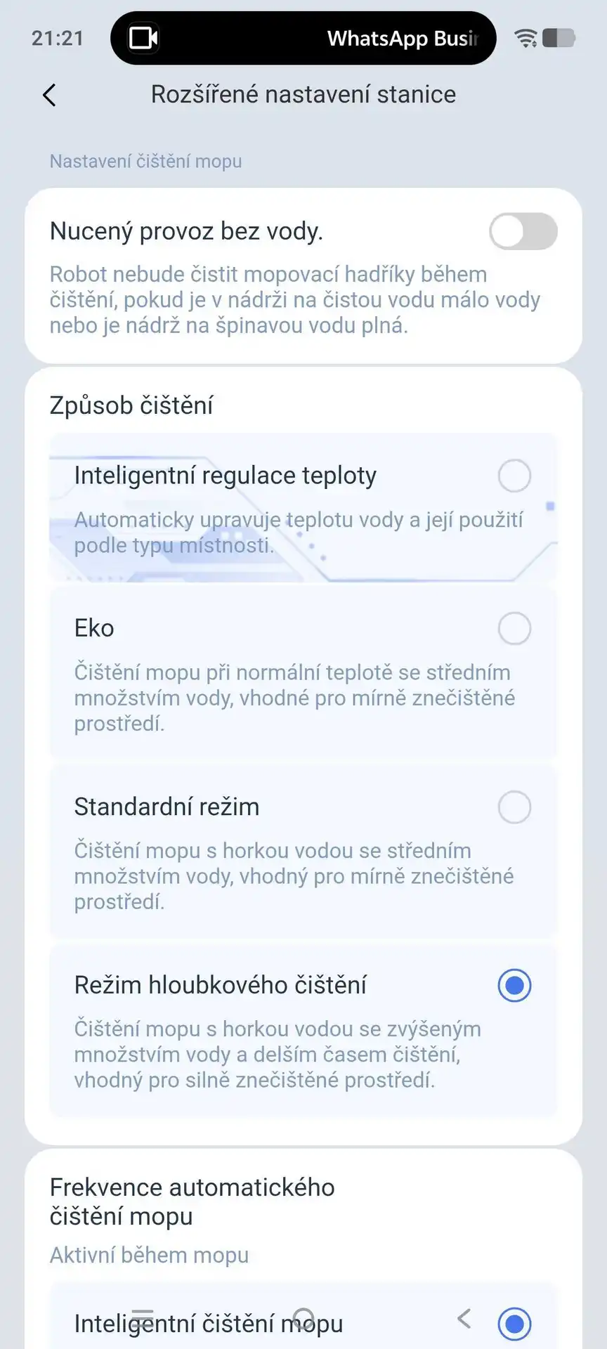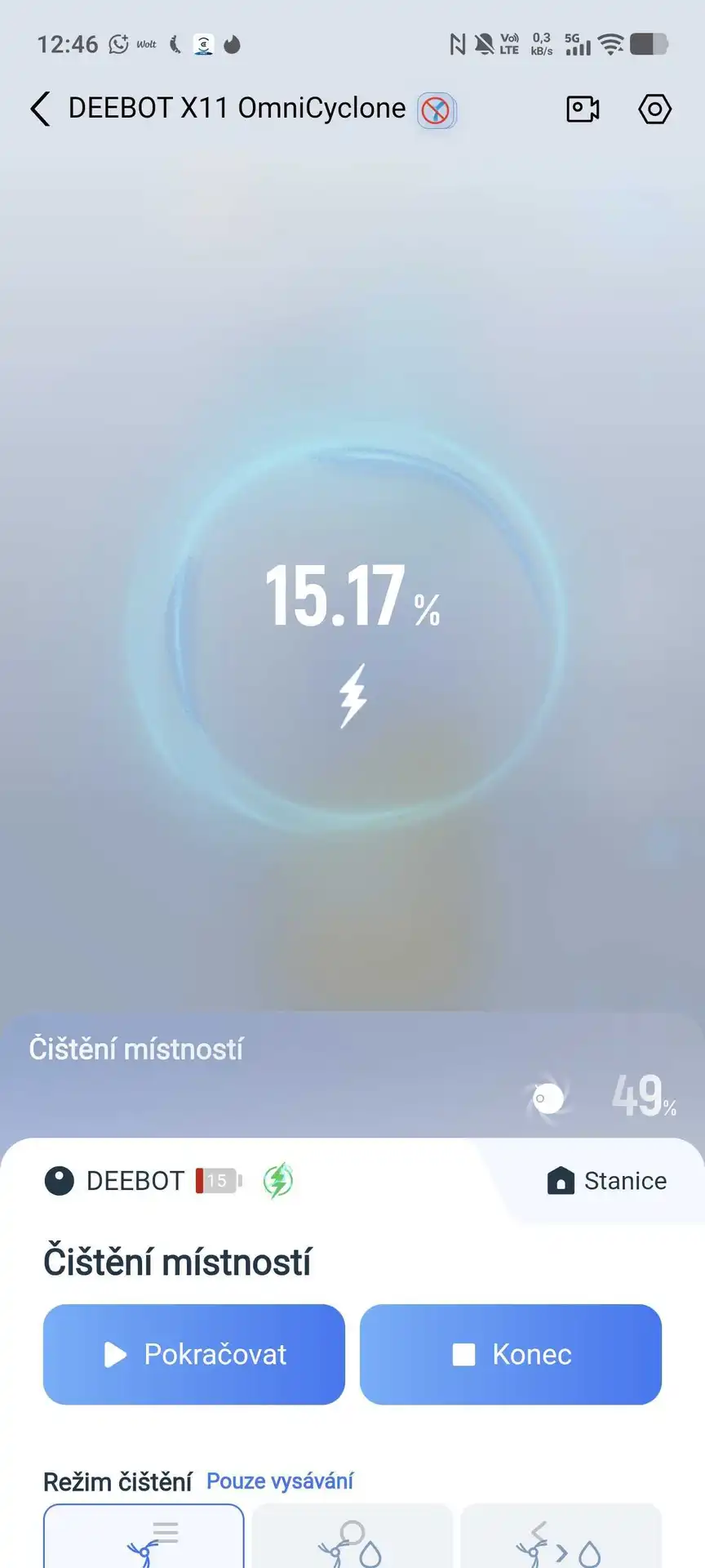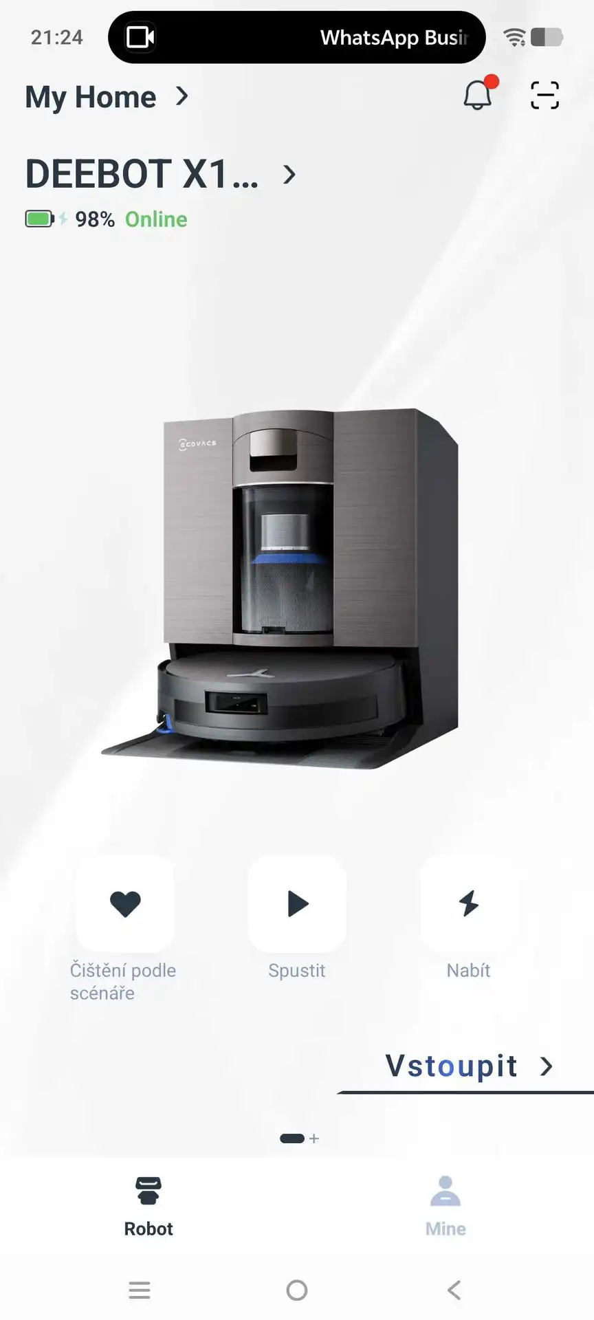 Aplikace Ecovacs nese název Ecovacs Home a funguje v češtině (vyjma hlasového asistenta). Po stránce nastavení je vybavená standardně pro svou třídu — nechybí volba výkonu sání, množství vody při vytírání, výběr místností ani plánování úklidu. Zajímavá je také AI detekce znečištění pro strategický úklid, který si vysavač řídí sám. V reálném životě se může stát, že necháte někde nějakou tu skvrnu zaschnout.