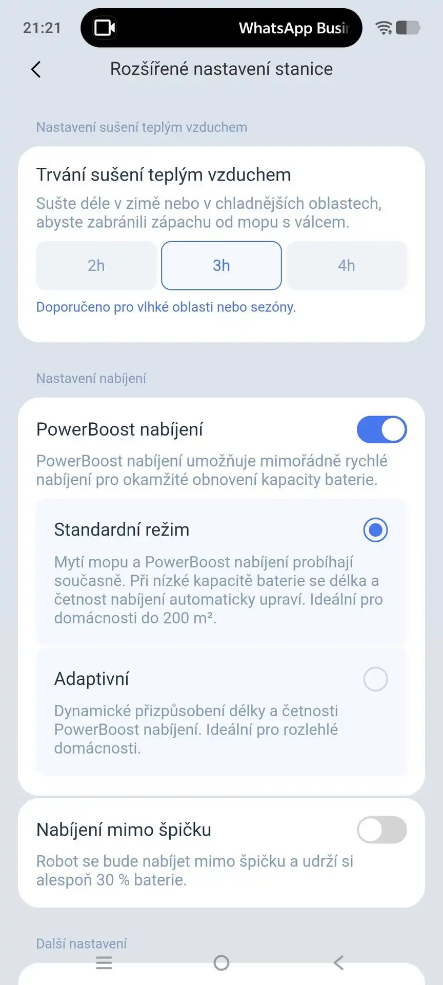 Foto: ArecenzeNa stanici mne také zaujala funkce rychlého nabíjení (PowerBoost). Když se vysavač v průběhu úklidu vrátí do stanice na čištění mopu, za 3 minuty si dobije 6 % baterie. To zní skromně, ale v součtu to vysavači umožňuje pokrýt plochu až 1 000 m² — bez toho, aby úklid musel přerušovat pro zdlouhavé nabíjení.