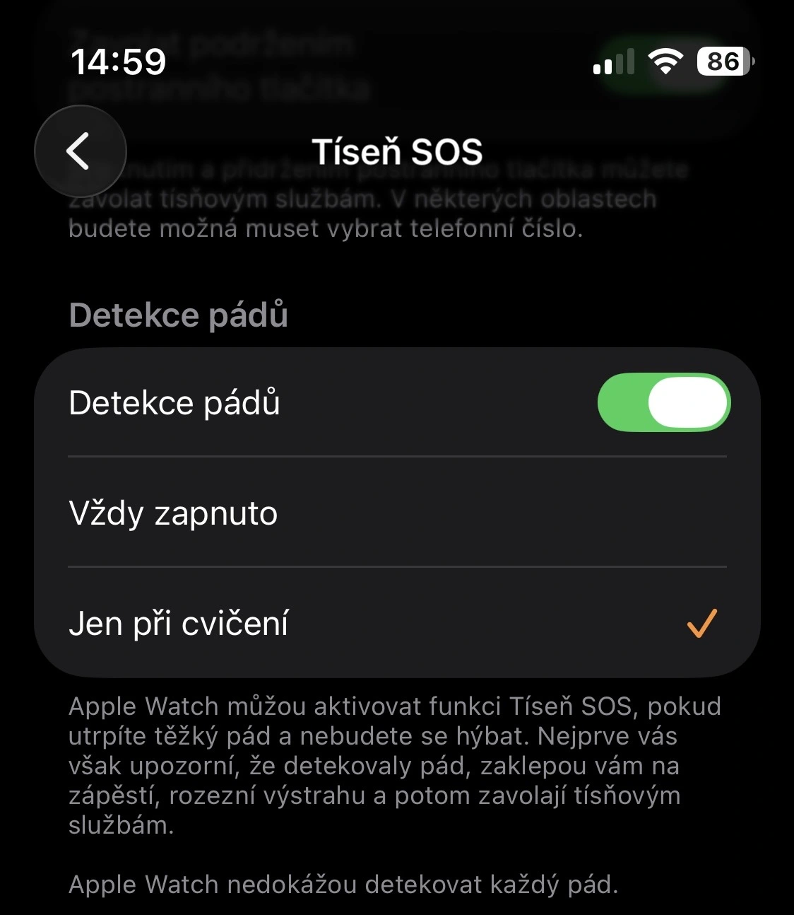 V nastavení watchOS lze zvolit, kdy má být detekce pádů aktivní.