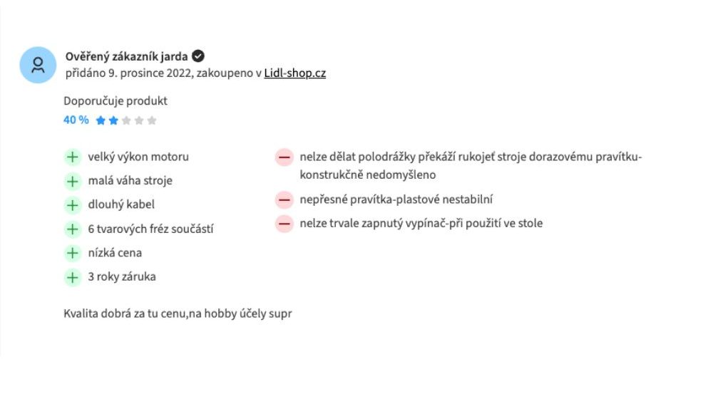 Minusových bodů najdeme v recenzích podstatně méně. Co se v komentářích opakuje, jsou nepřesná pravítka a méně kvalitní zpracování některých plastových součástí frézky. Obecně se recenze shodují na tom, že pro hobby využití je přístroj dobrý, profíka už tolik nenadchne.