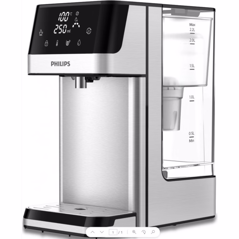 Dávkovač vody Philips ADD5910M/10 s filtrem Micro X-Clean poskytuje čistou vodu vhodnou pro čaj, kávu i běžné pití. Přístroj má odnímatelnou 2,2 l nádobu, pět přednastavených objemů (150–500 ml) a šest teplotních nastavení až do 100 °C. Filtr snižuje obsah chlóru, vodního kamene, těžkých kovů a mikroplastů, a odnímatelná nádoba usnadňuje doplňování a čištění.