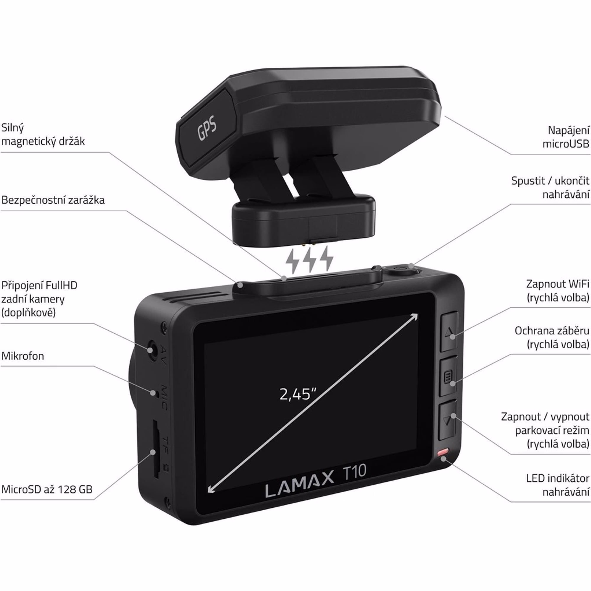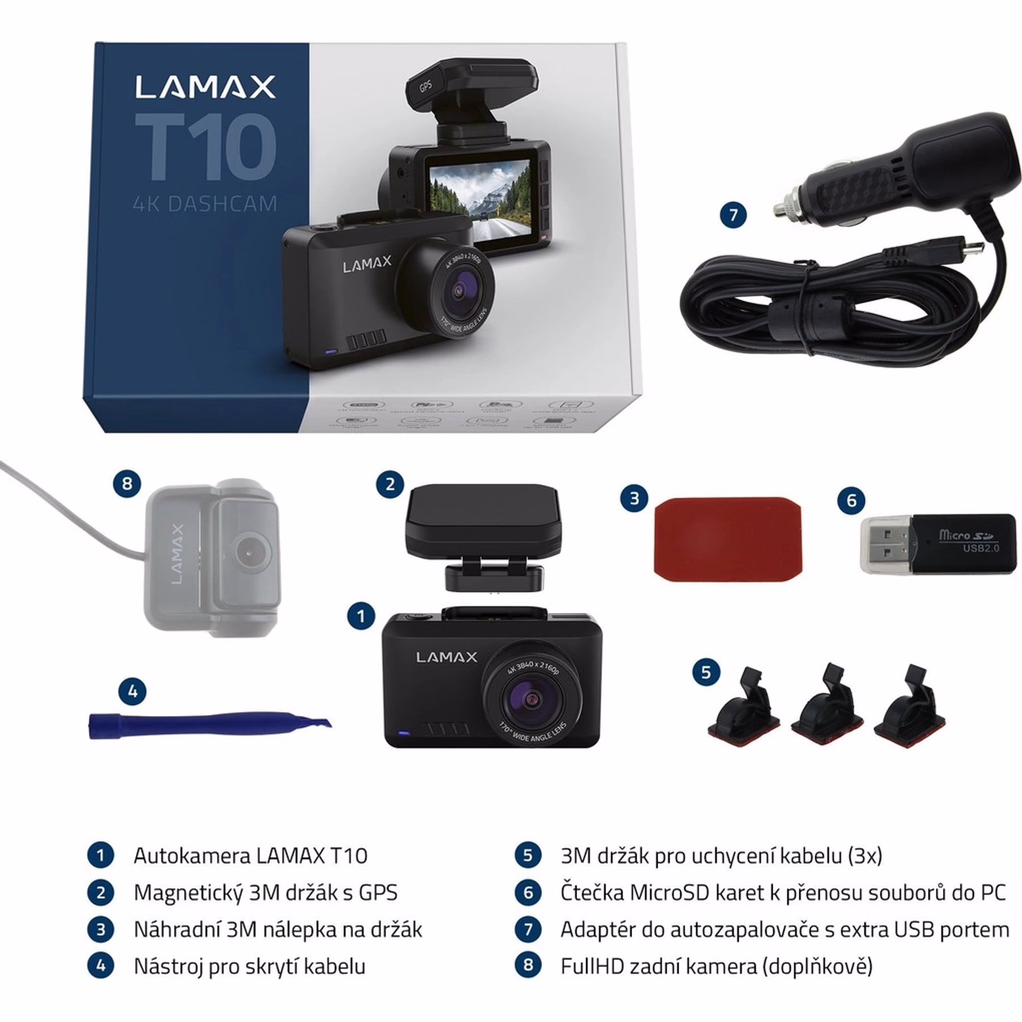 - Režimy záznamu a příslušenství – Kromě 4K rozlišení nabízí LAMAX T10 také možnost záznamu ve Full HD při 60 fps, což je ideální pro zachycení rychlého pohybu. Kamera podporuje paměťové karty až do velikosti 128 GB a díky modernímu kodeku H.265 dokáže efektivně komprimovat video beze ztráty kvality. Součástí balení je také napájecí adaptér do auta s USB portem navíc, držáky pro kabely a volitelně i přídavná zadní kamera s Full HD rozlišením, kterou je v případě zájmu nutno dokoupit.