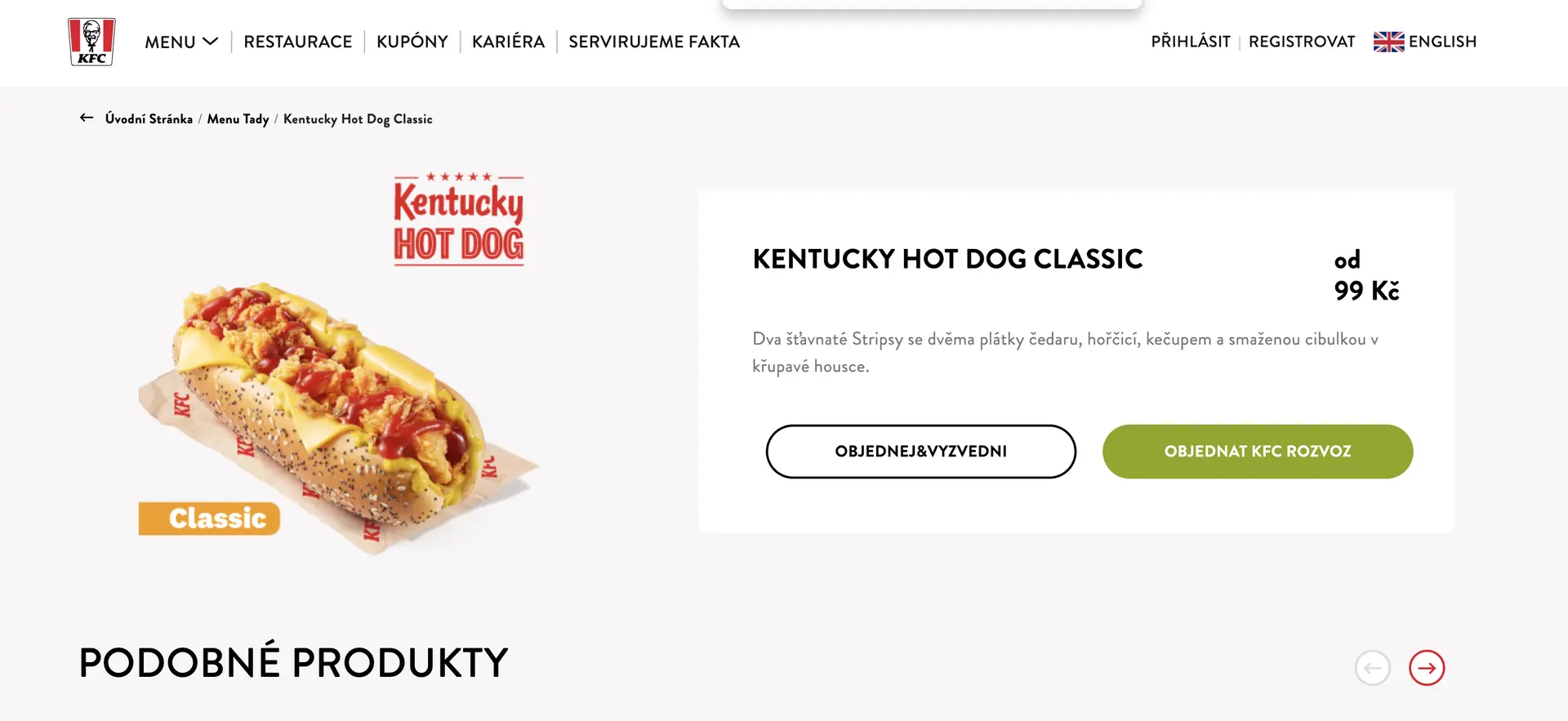 Foto: Screenshot, kfc.czJako alternativu KFC doporučuje Kentucky hot dog, ten je ale o dost dražší.