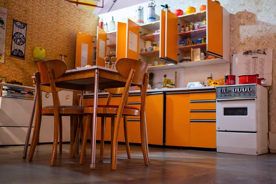 Kuchyně v panelákových bytech byly miniaturní, ale dokázaly nemožné. Kuchyňská linka z jednoduchých skříněk, pracovní deska z umakartu, nahoře skříňky na lepší nádobí, dole hrnce, tlakáče, remoska a smaltované pekáče. U stolu stály obvykle čtyři židle, někde přibyla lavice. Starší byty ještě mívaly kredenc.