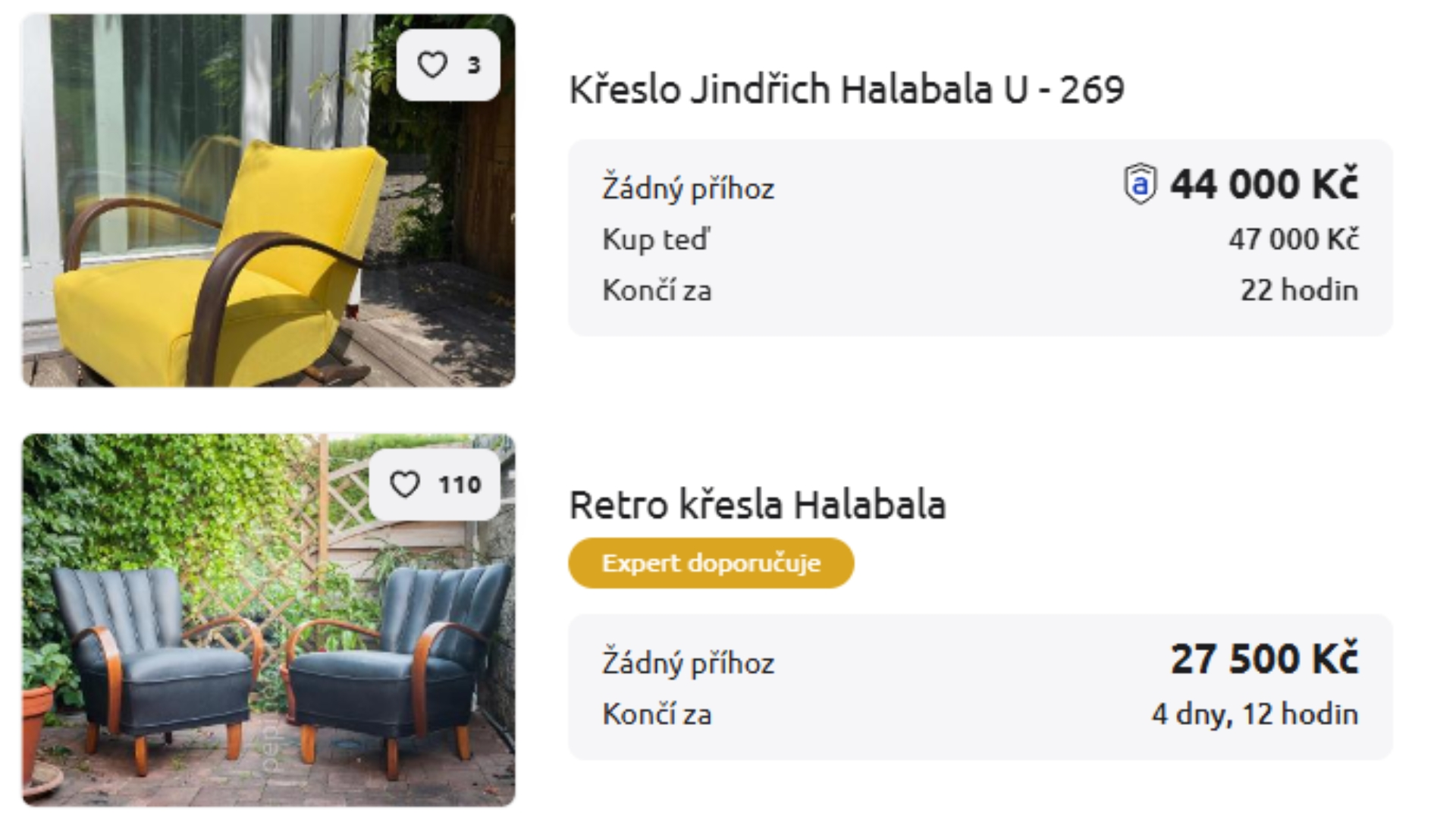 - Komentář šéfredaktora: Některé „vintage“ kousky mohou mít skutečně vysokou hodnotu. Důkazem jsou například křesla značky Halabala. Ta se v dobrém stavu běžně prodávají s cenami v desítkách tisíc korun. Když zjišťuji, kolik tyhle vintage věci dneska stojí, je mi trochu smutno, že se za poslední dekády ledacos vyhodilo.