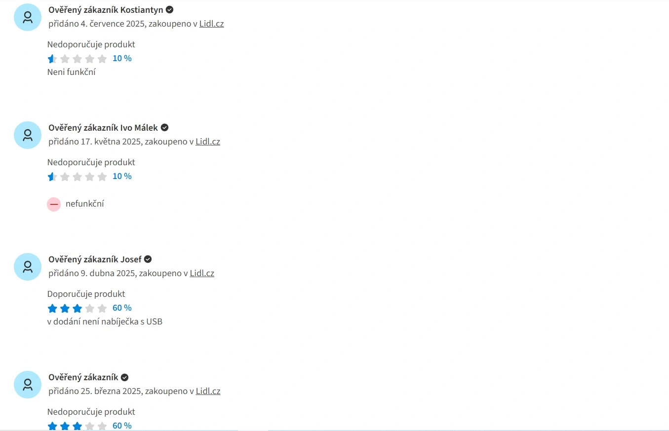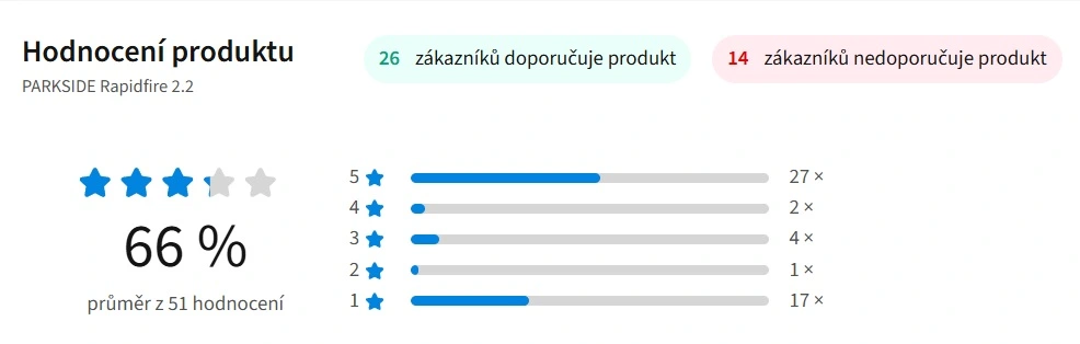 Nejhorší hodnocení z aku šroubováků Parkside má Rapidfire 2.2. Z 51 hodnotitelů ho 14 silně nedoporučuje a 17 lidí mu udělilo pouze 1 hvězdičku z maximálních pěti. Nejčastější výtky se týkají nefunkčních výrobků, vadného dobíjení nebo rychlého vybíjení. Ke kladům naopak patří snadné ovládání a solidní točivý moment postačující na domácí montování.