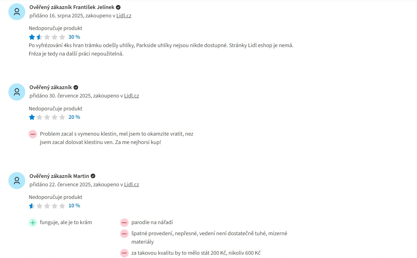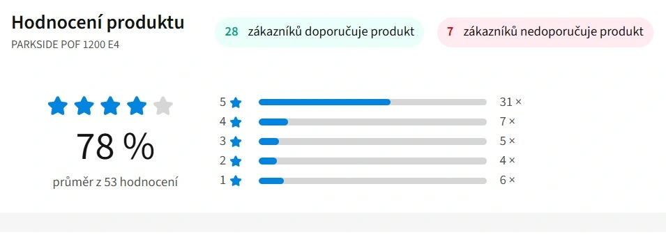 6dílná sada fréz do dřeva PARKSIDE POF 1200 E4 se vyznačuje jednoduchou obsluhou, solidním výkonem a možností regulace otáček. Řada uživatelů si ale stěžuje na samotnou konstrukci, která působí nekvalitně a chatrně. Řezy jsou navíc prý nepřesné, pohyb trhaný a uhlíky rychle odcházejí. Má celkem 53 hodnocení zákazníků, z čehož šest lidí udělilo 1 hvězdičku a sedm zákazníků frézu nedoporučuje.