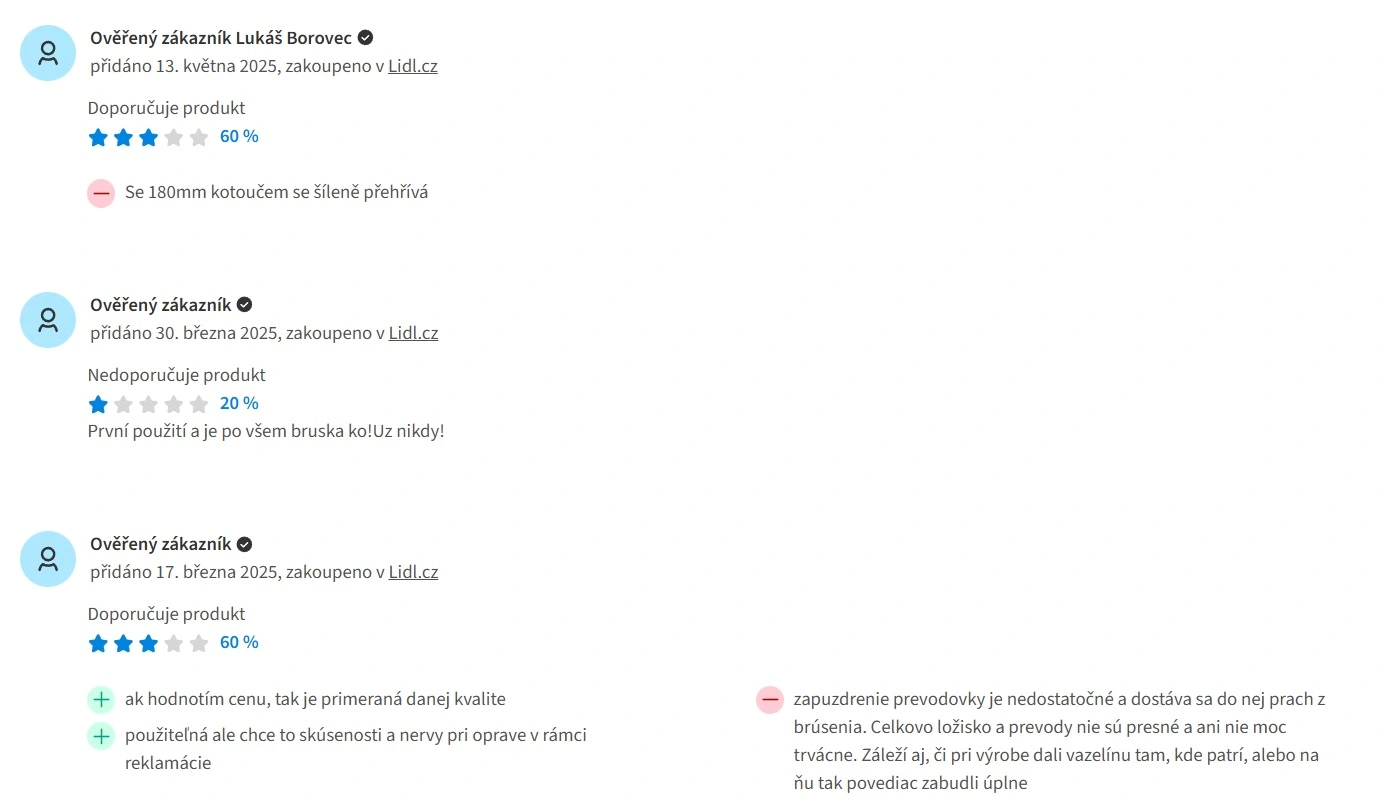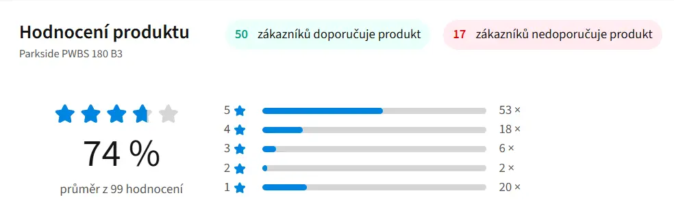Nejhorší hodnocení z brusek Parkside má Parkside PWBS 180 B3. Někteří zákazníci si sice pochvalují dobré odsávání, dostatečný výkon a možnost regulace otáček, ale jiní si stěžují na přehřívání. A to klidně už po 15 minutách práce. Spousta lidí také žehrá na vysokou hlučnost a kolísání otáček. Z 99 hodnocení je 20 jednohvězdičkových a 17 zákazníků brusku nedoporučuje.