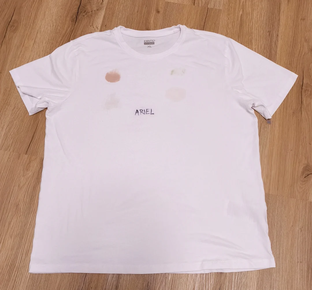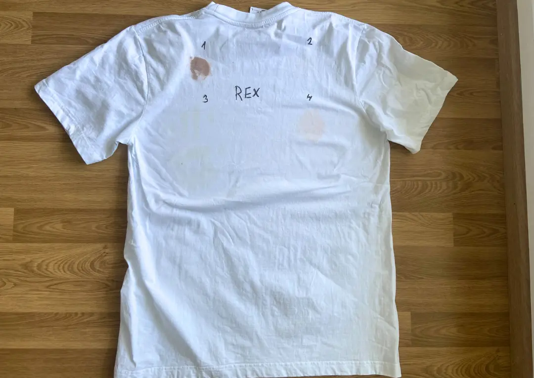 Skvrny jsme nechali zaschnout. Poté jsme trička namočili ve vodě, na znečištěná místa nanesli doporučenou dávku prášku pro silně znečištěné prádlo podle návodu výrobce, nechali prášek 30 minut působit a následovalo praní na 40 °C v běžném programu a usušení. Každou skvrnu jsme ohodnotili na škále 0–10 bodů podle toho, jak moc byla po vyprání vidět.