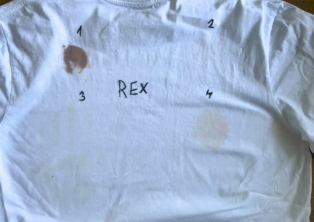 Pro všechny prášky platil stejný postup. Testovali jsme na bílých bavlněných tričkách, aby byl rozdíl dobře vidět. Na každé tričko jsme nanesli čtyři typické skvrny: