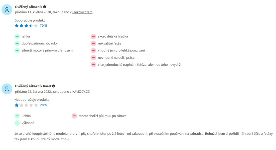 Jako alternativu jsme vybrali od stejných výrobců modely řetězových pil s výrazně lepším hodnocením: