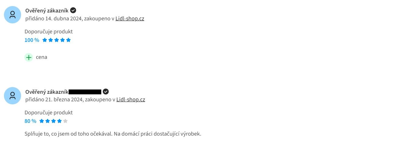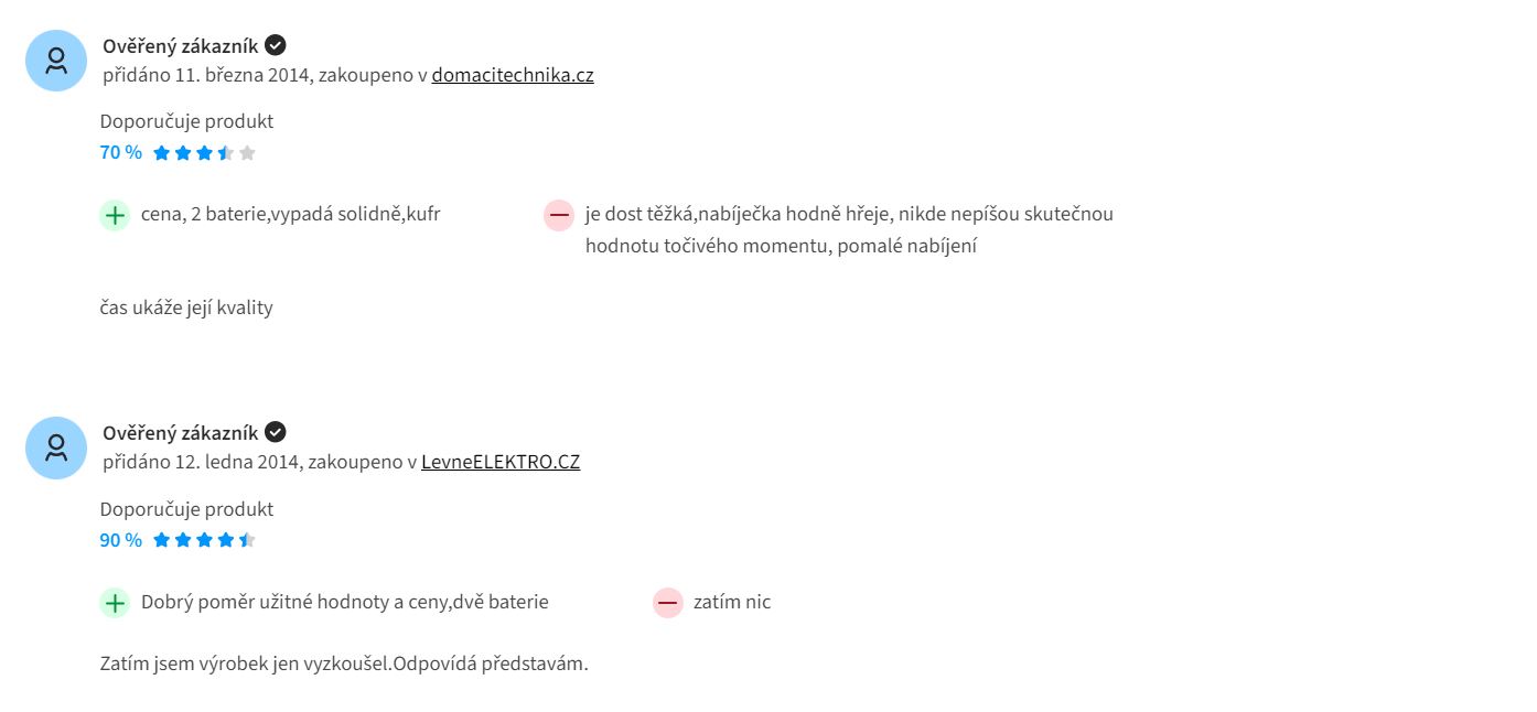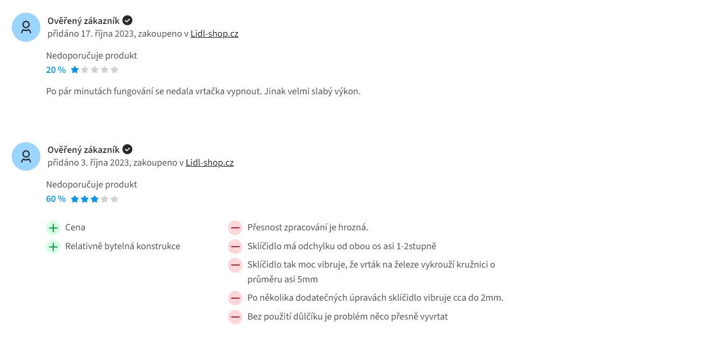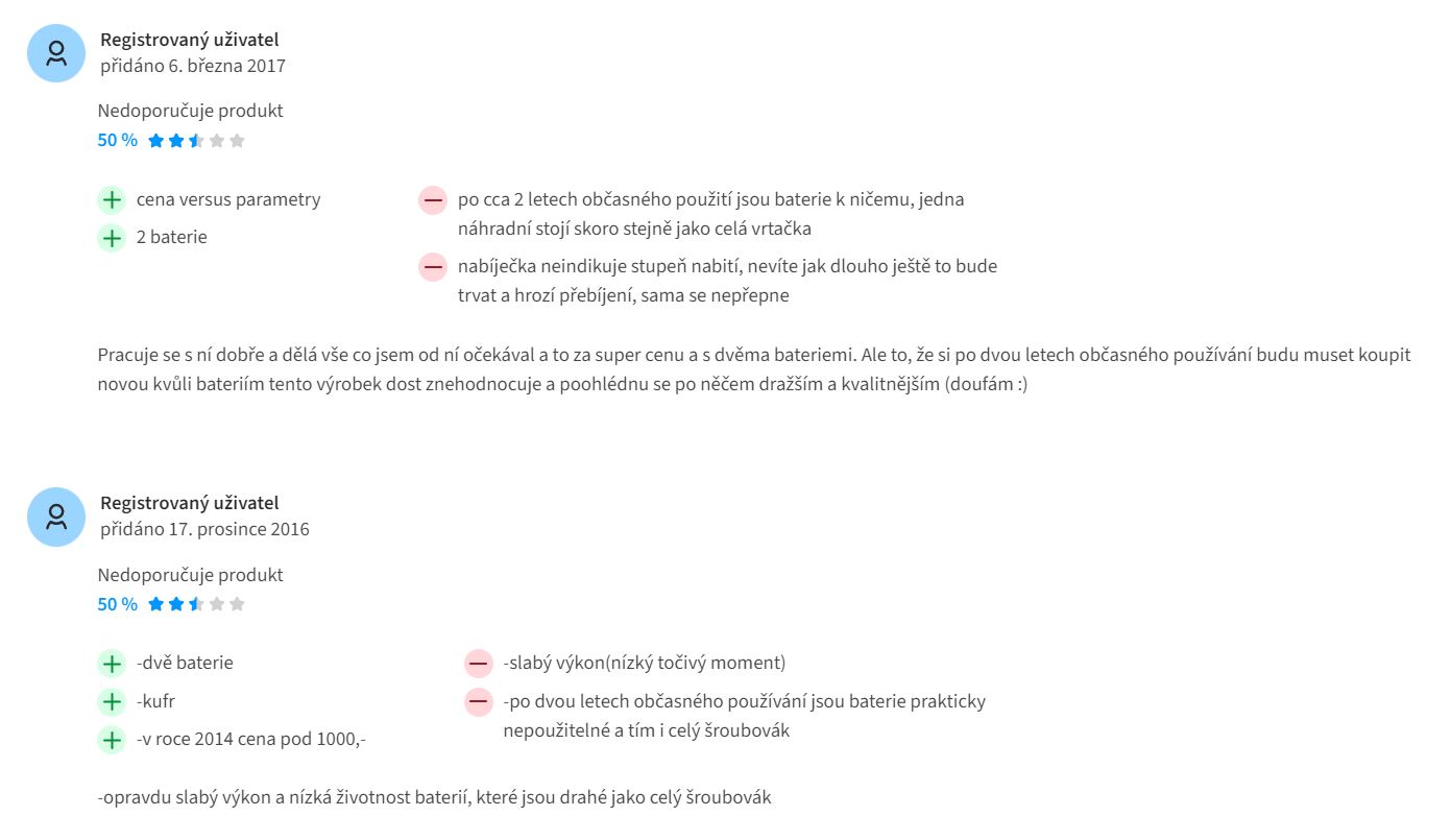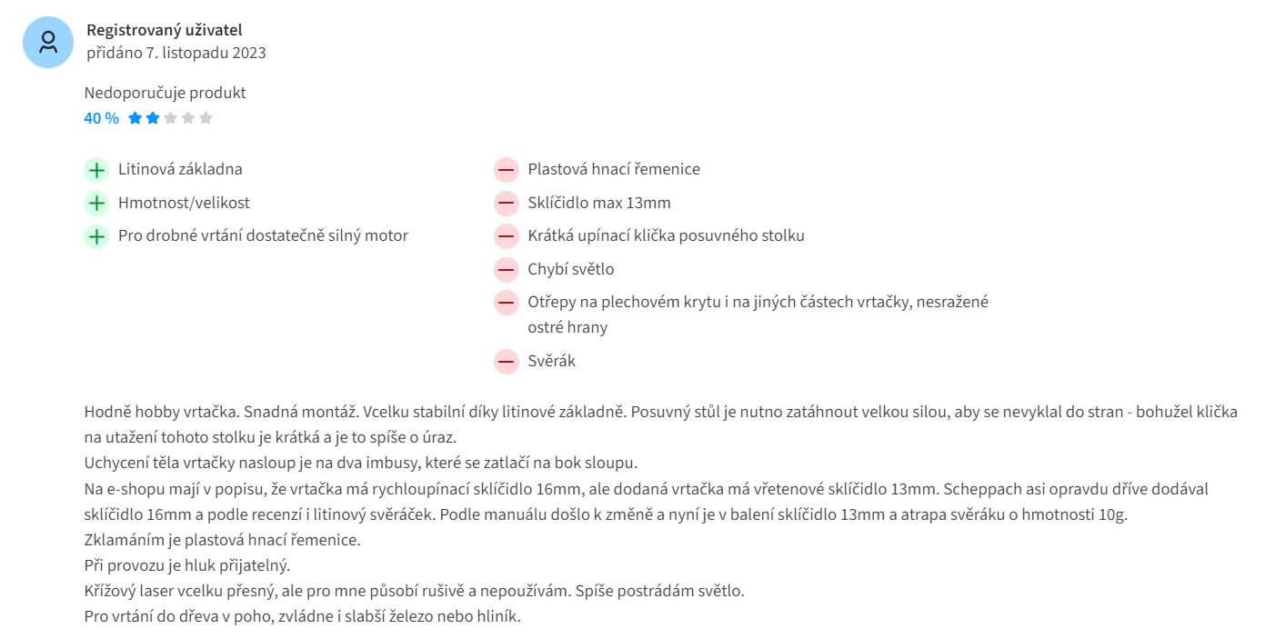 Na Heurece je vrtačka hodnocena jen 75 %. Ostatně její špatnou kvalitu mohu osobně potvrdit na základě osobní zkušenosti (více v této recenzi). Uživatelé na vrtačce nejvíce chválí a naopak nejvíce kritizují tyto vlastnosti: