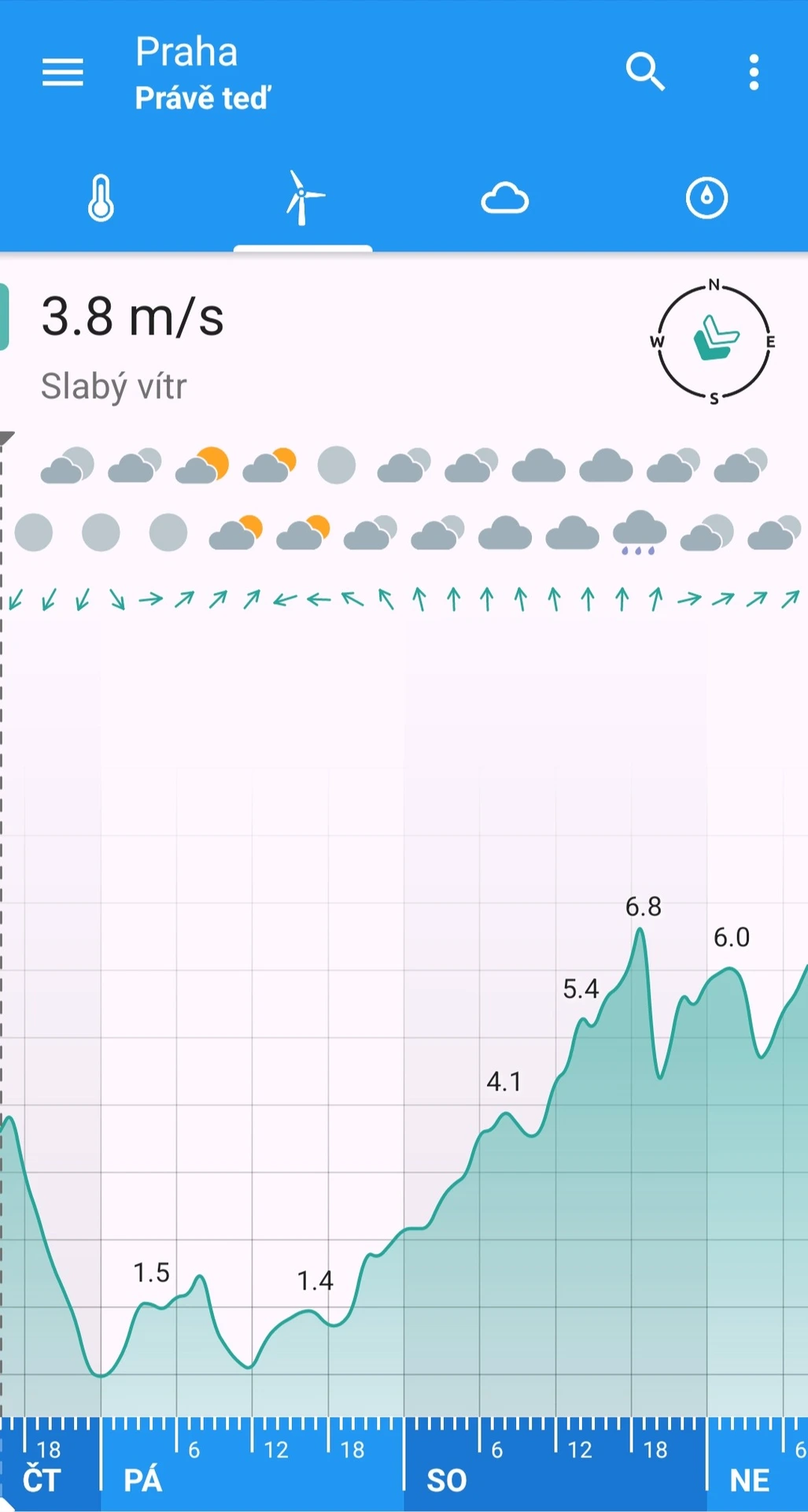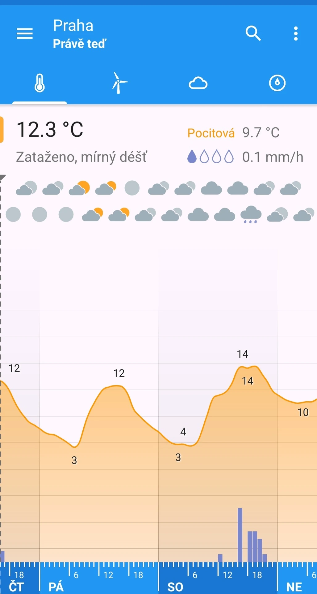 Aplikace českých vývojářů Androworks čerpá data z norského modelu a zaměřuje se hlavně na jednoduché zobrazení hodnot na čtyřech obrazovkách. Mezi nimi jednoduše přepínáte posouváním doprava. Na té hlavní zobrazuje předpověď teploty spolu se srážkami a symbolem pro oblačnost. Kromě předpovědi ve formě grafu, kterou hodnotíme jako velmi přehlednou, nabízí i předpověď po řádcích.