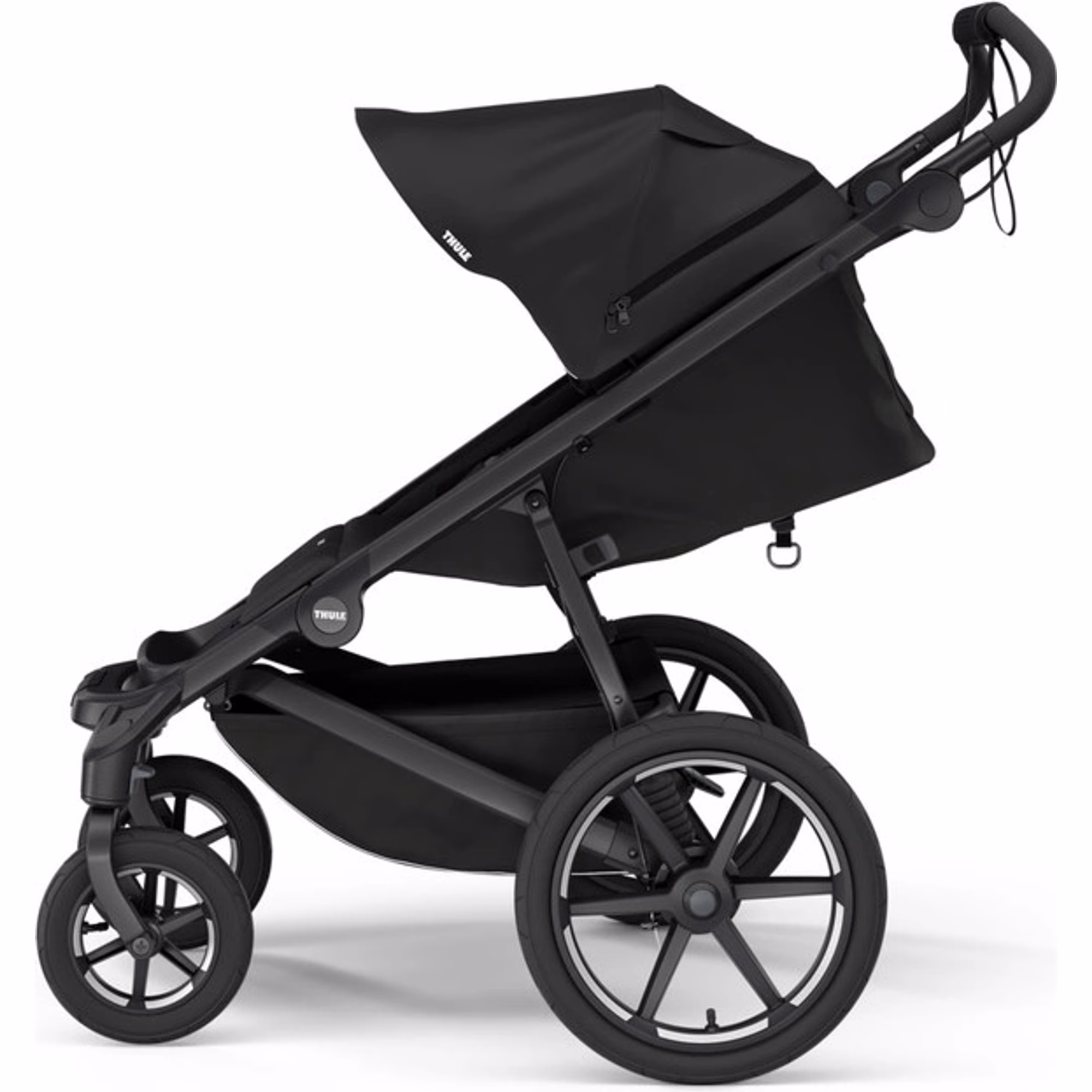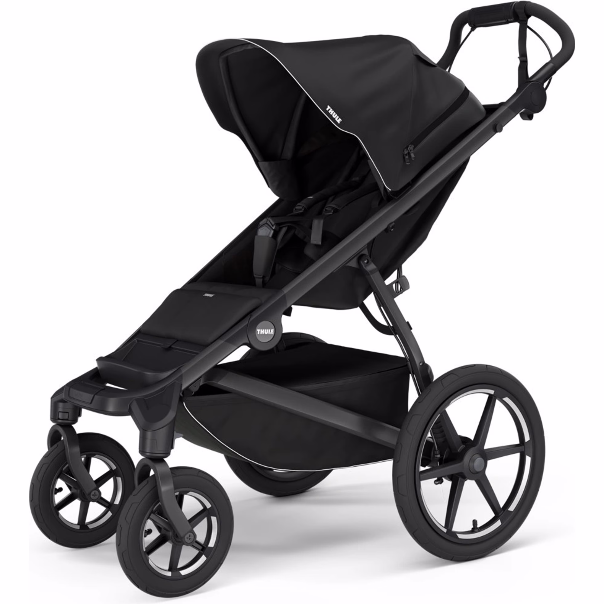 Stejně jako u tříkolové varianty, i u tohoto kočárku hrají prim velká terénní kola. Ty jsou vyplněná vzduchem a díky kvalitnímu odpružení zvládnou i velmi náročný terén. Thule patří k modelům, které se nemusíte bát vzít ani na lesní stezky, což se o většině konkurenčních kočárků, určených spíš na zpevněný rovný povrch, říci nedá. Přední kola můžete v případě nutnosti zaaretovat a usnadnit si tak jízdu sněhem či třeba kamenitou cestou.