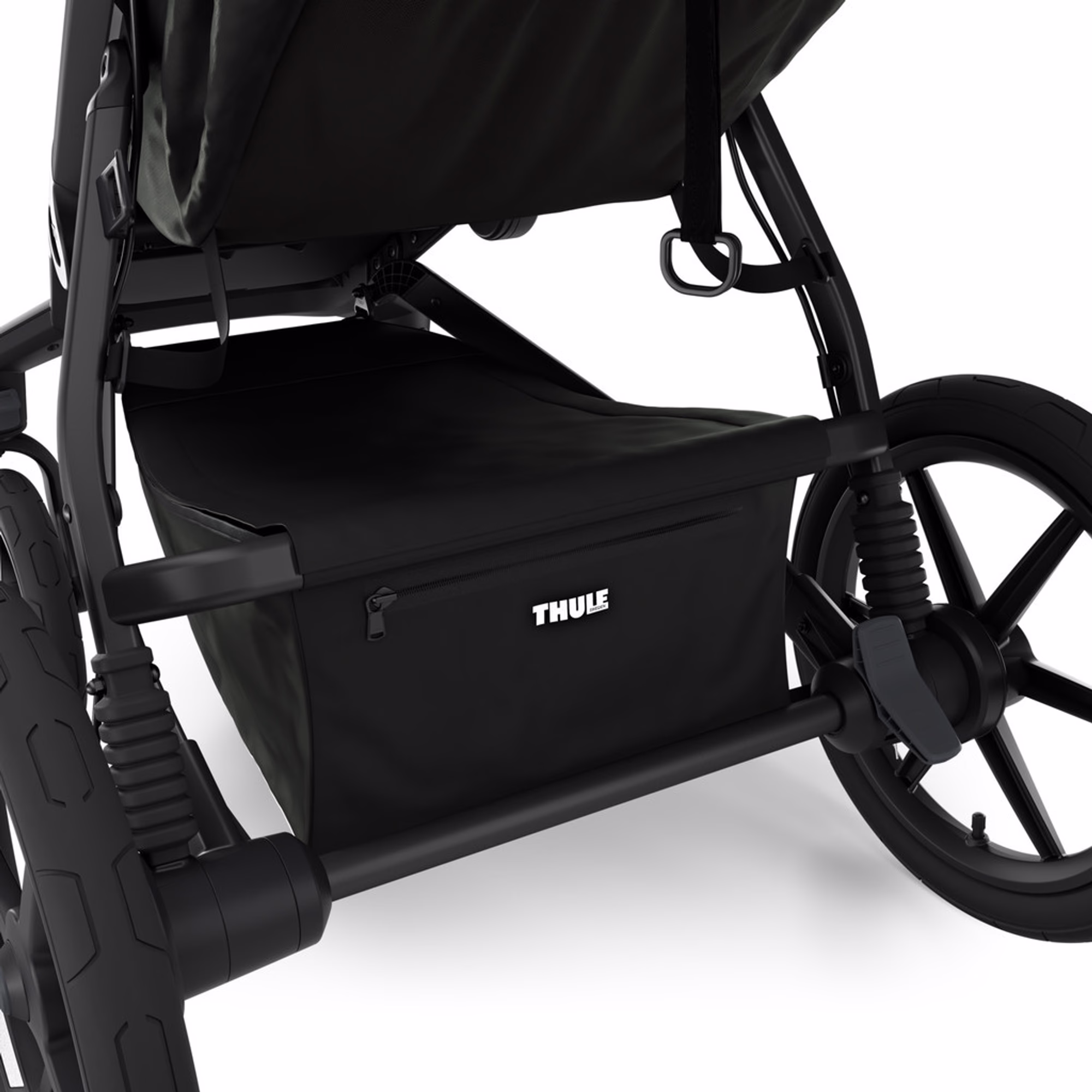 Ve spodní části kočárku naleznete klasicky úložný koš. V tomto případě je benefitem jeho extrémní nosnost, uvezete v něm totiž až 10 kg nákladu. Standardní nosnost spodního koše kočárků se většinou pohybuje kolem 3 kilogramů. Výhodou je také fakt, že Thule má koš zakrytý. Při výletech vám z něj tedy nic nevypadne a nemusíte se bát ani nákupu od bláta či děště.