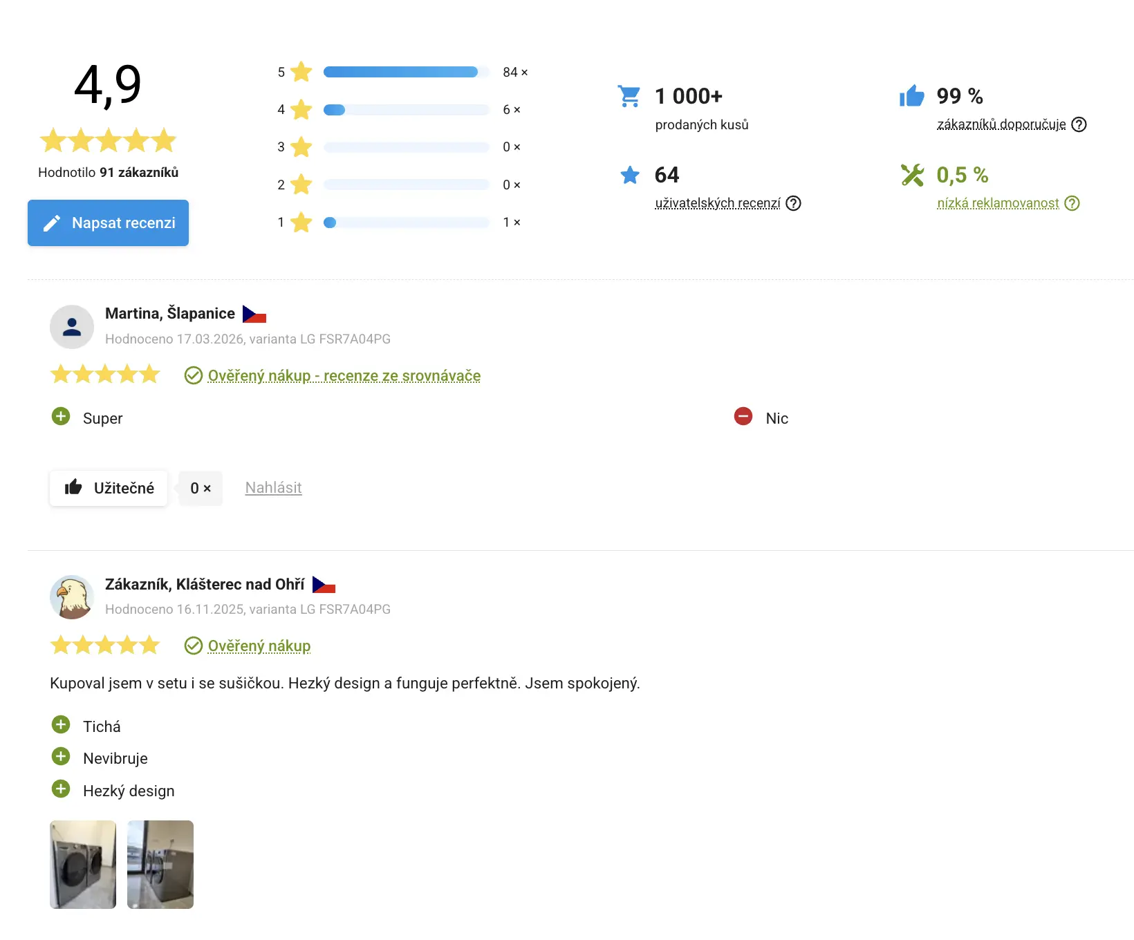LG FSR7A04PG je pračka spadající do pomezí střední a vysoké cenové relace. Na Alze si ji zakoupilo už více než 1 000 zákazníků a její hodnocení se na tomto e-shopu vyšplhalo na 4,9 z 5 hvězdiček. Na Heurece je pak hodnocená 95 % a mimo to zaujme také značkou kvality nezávislé organizace dTest.