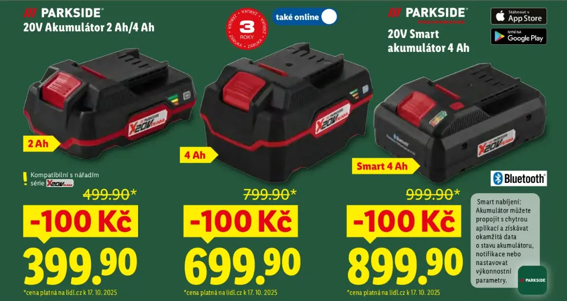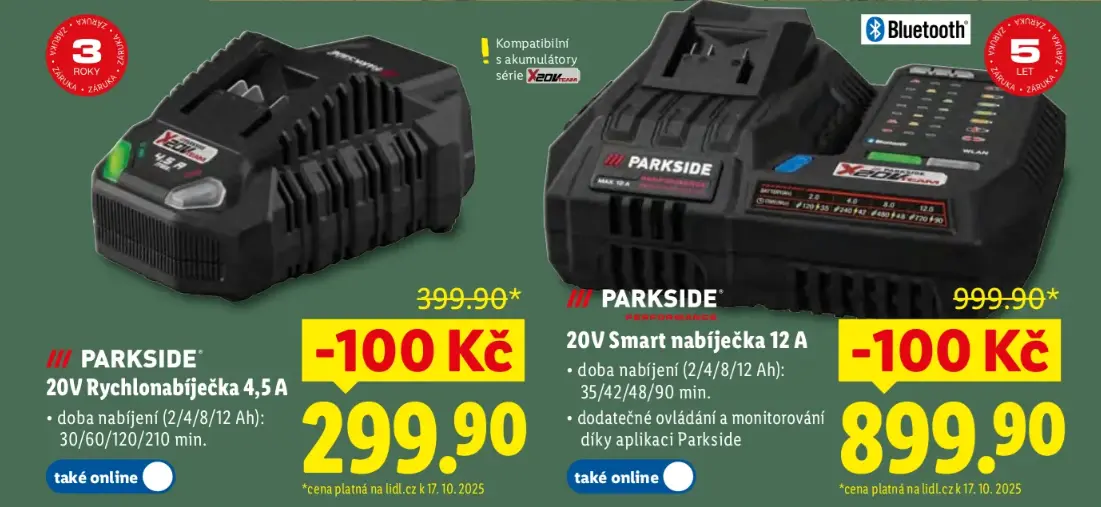 Foto: Screenshot Akční leták LidlVe stejném termínu, tedy od 30. října do 2. listopadu 2025, budou v prodejnách Lidl i online na e-shopu k dostání také kompatibilní akumulátory a nabíječky z řady Parkside X 20 V Team – a to se slevou 100 Kč na kus. Akční nabídka zahrnuje akumulátory o kapacitách 2 Ah a 4 Ah, včetně Smart verze.
