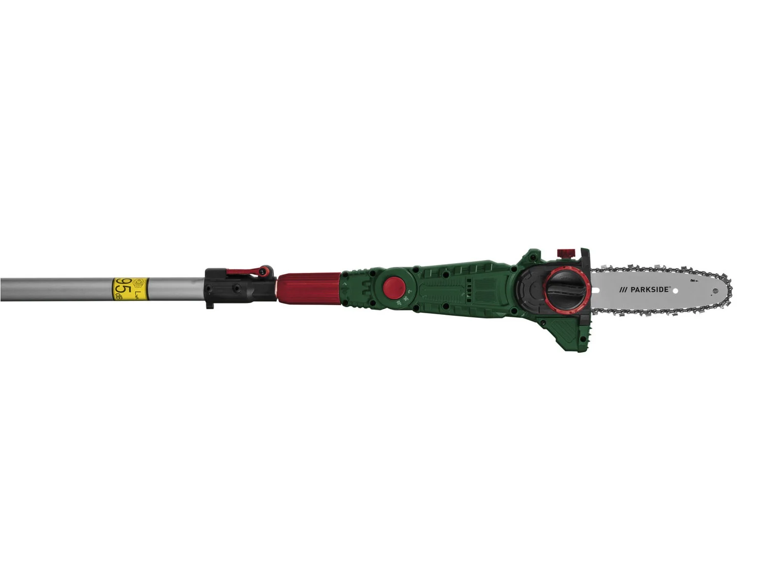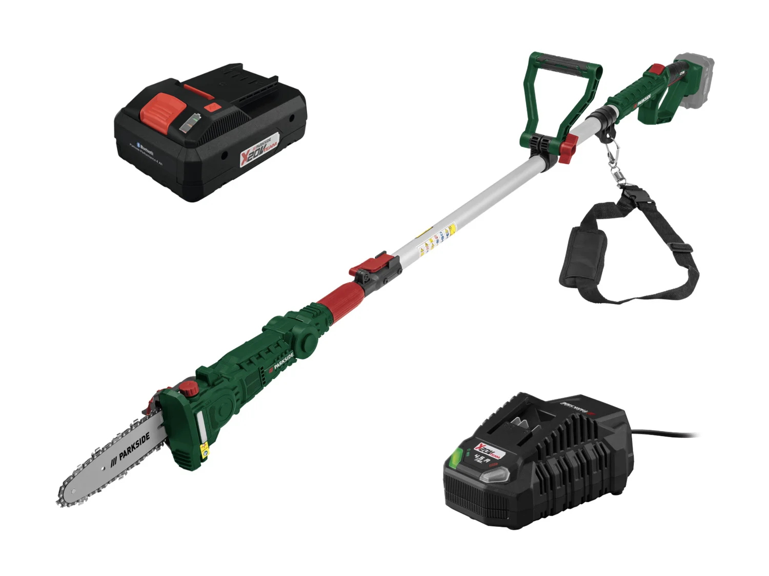Díky teleskopickému držadlu je zařízení ideální na prořezávání až do výšky 4 metry. Poradí si s větvemi do průměru 20 cm. Optimální řezání i na těžko přístupných místech zajistí výkyvná hlava. Rychlonapínání řetězu je beznástrojové, systém mazání řetězu je automatický. Záruka je opět 3 roky.