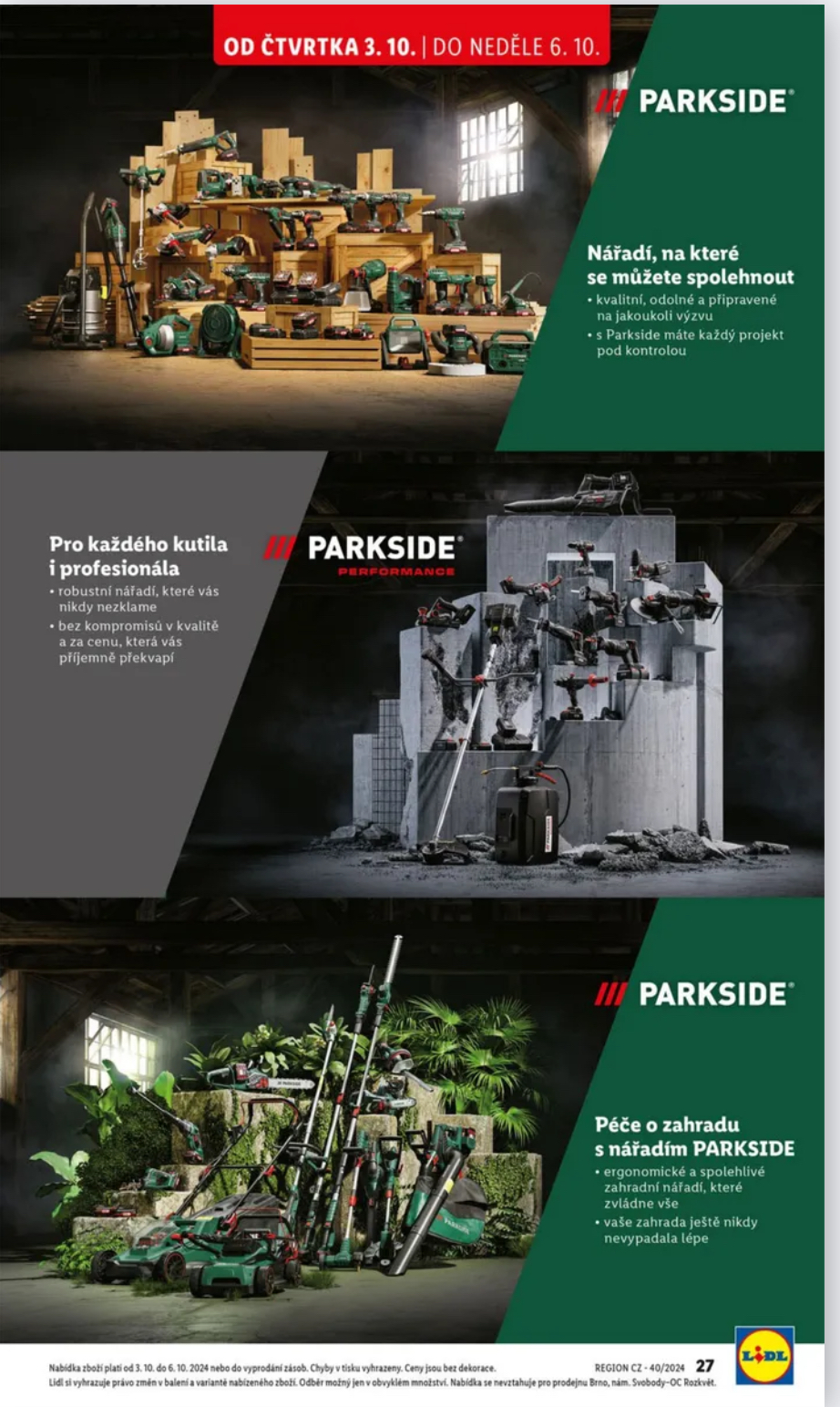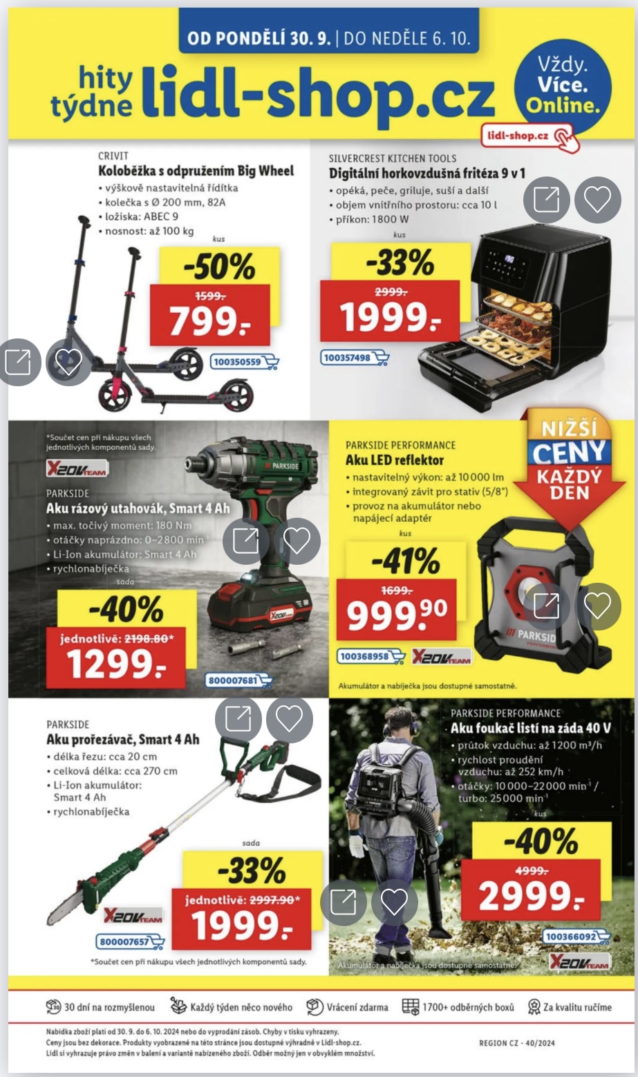 Lidl nabízí prakticky neustále nářadí Parkside za super ceny. Slevy často dosahují až k 50 %. Aktuální akční nabídka na e-shopu (30.9. – 6.10.) zaujme především díky aku rázovému utahováku, který je dodáván se Smart akumulátorem a rychlonabíječkou o 40 % levněji. V dílně, garáži či na stavbě jistě oceníte výkonný aku reflektor z řady Performance. Na ošetřování vzrostlých stromů je ideální aku prořezávač s teleskopickým držadlem.