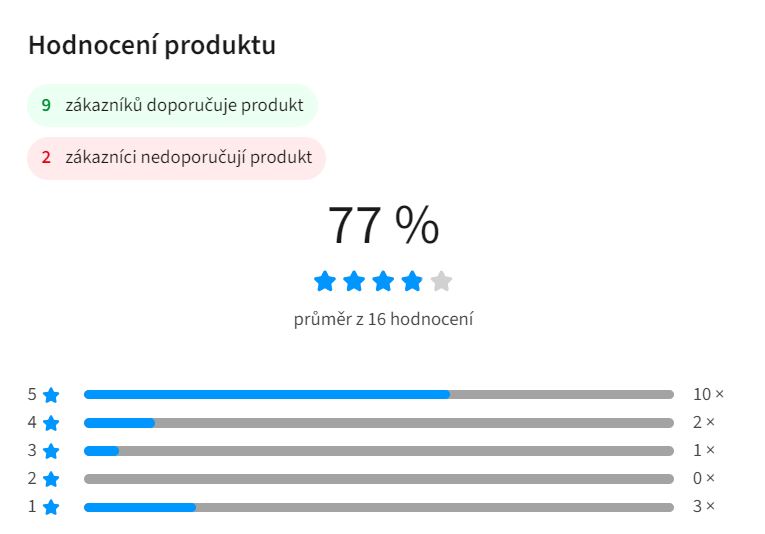 - Uživatelské hodnocení Heureka 77 % (16 recenzí)