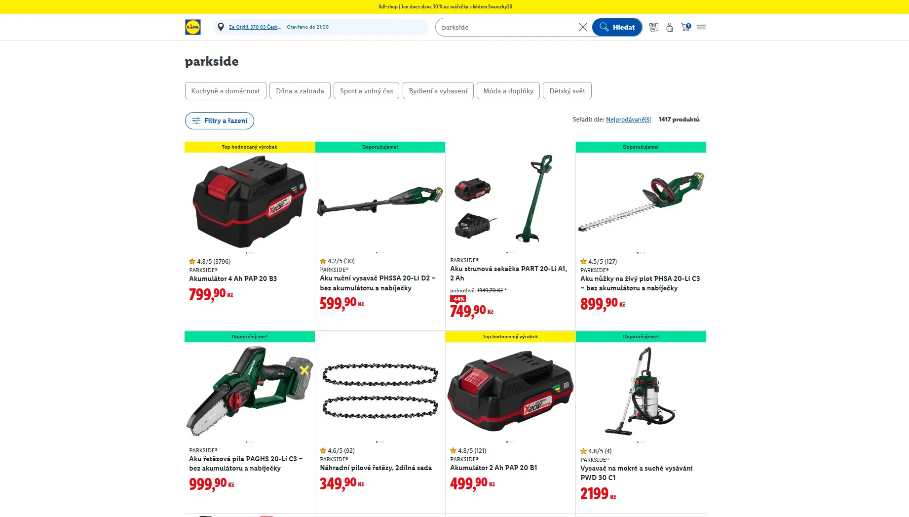 V online prostředí vede dlouhodobě akumulátor Parkside X 20 V Team s kapacitou 4 Ah (800 Kč). Není divu – bez baterií se žádné aku nářadí neobejde a jednotný systém umožňuje pohánět desítky různých strojů. Protože na prodejnách nejsou akumulátory vždy dostupné, zákazníci je často objednávají online.