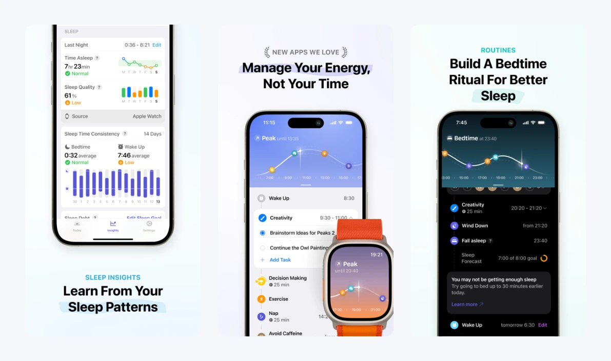 Foto: Oficiální materiály vývojářePeaks je aplikace zaměřená na spánek a denní energii. Na základě dat o spánku odhaduje, kdy má uživatel nejlepší soustředění, kdy přichází útlum a kdy je naopak vhodné si odpočinout. Vychází z modelu cirkadiánního rytmu a nedostatku spánku, zobrazuje energetické vrcholy i poklesy. Pomáhá s načasováním spánku, zobrazuje skóre regenerace a další zdravotní ukazatele. Funguje s daty z Apple Watch, Apple HealthKit, Oura Ring i Garminu, nabízí widgety, export do kalendáře, zkratky a upozornění. Veškeré výpočty přitom probíhají přímo v zařízení bez odesílání zdravotních dat na servery třetích stran.