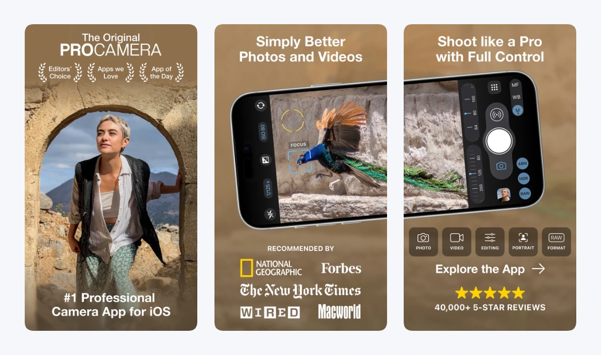 Foto: Oficiální materiály vývojářeProCamera je profesionálně zaměřená aplikace pro focení a natáčení na iPhonu, iPadu a Apple Watch. Zvládne rychlé a jednoduché použití, ale zároveň nabízí i pokročilé manuální ovládání.