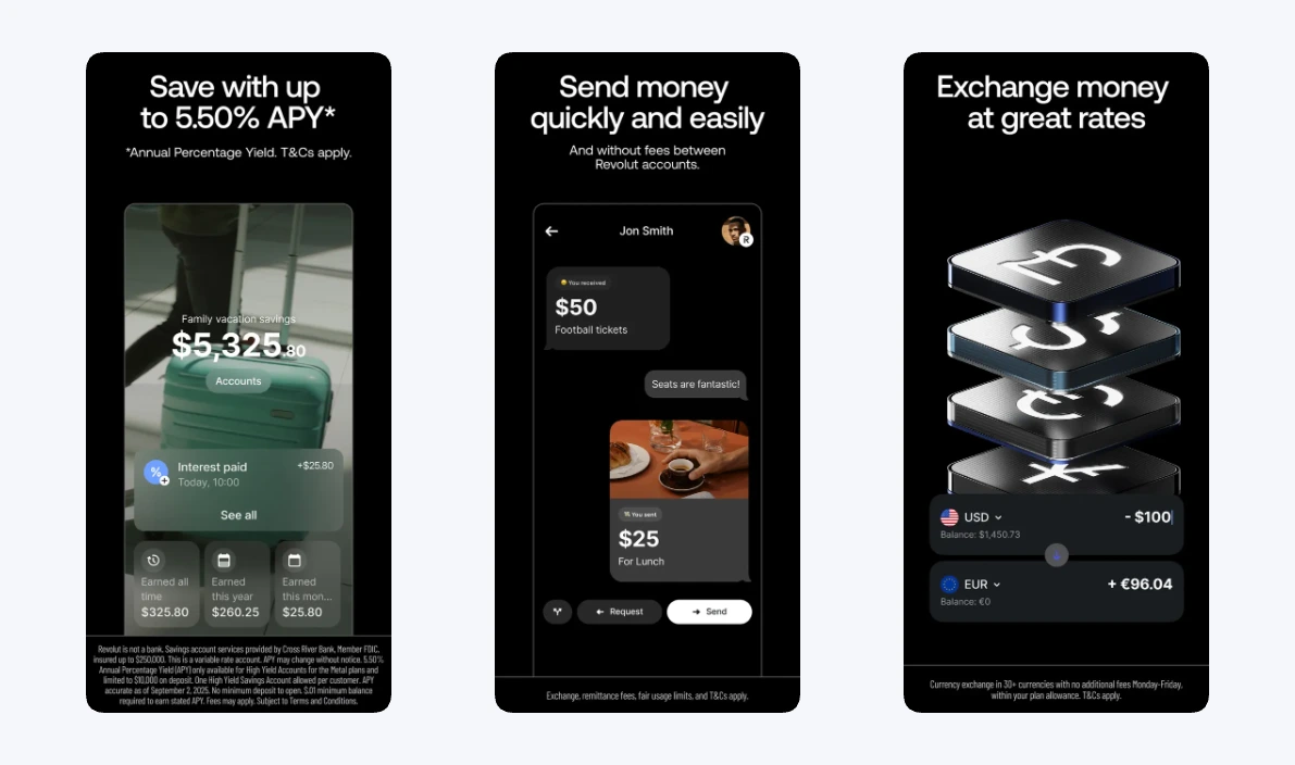 Foto: Oficiální materiály vývojářeRevolut je finanční aplikace, která se zaměřuje na správu peněz, placení, posílání peněz a spoření. Platit je možné fyzickou i virtuální kartou, používat Apple Pay, směňovat a posílat více než 25 měn, rozdělovat účty a mít přehled o výdajích díky rozpočtovým a analytickým nástrojům. Umožňuje také spořit přes Savings Vaults a investovat do akcií. Nechybí ani bezpečnostní funkce, jako je zmrazení karty, jednorázové virtuální karty, limity výdajů a průběžná upozornění na transakce.